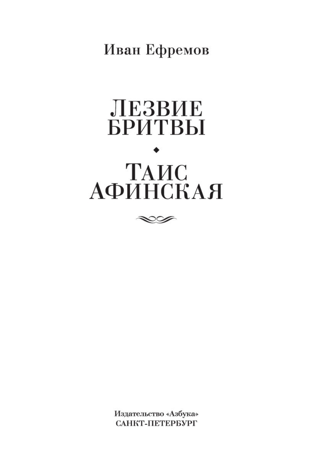 книгу включены два известных романа классика отечественной научной фантастики Ивана Ефремова. В «Лезвии бритвы» (1963) тесно переплетаются различные места действия и исторические эпохи, сюжетные линии и человеческие судьбы. Попытки разгадать тайну древней короны, которая, возможно, когда-то принадлежала Александру Македонскому, приключения группы итальянцев на побережье Намибии, где, по слухам, скрывается богатейшая алмазная россыпь, вызволение индийской красавицы-актрисы из лап алчного киномагната, опыты по пробуждению генетической памяти, сокрытой в подсознании человека, постижение художниками секретов искусства и философии былых времен и тайн физической красоты – все эти, казалось бы, никак не связанные друг с другом события разделяет, по мысли автора, лишь «лезвие бритвы»… В своем последнем романе «Таис Афинская» (1971), основанном на подлинных исторических событиях IV в. до н. э., автор воссоздает образ легендарной афинской гетеры Таис, спутницы героев античного мира, среди которых – полководец Птолемей и «царь царей» Александр Македонский, жаждущий покорить весь мир…