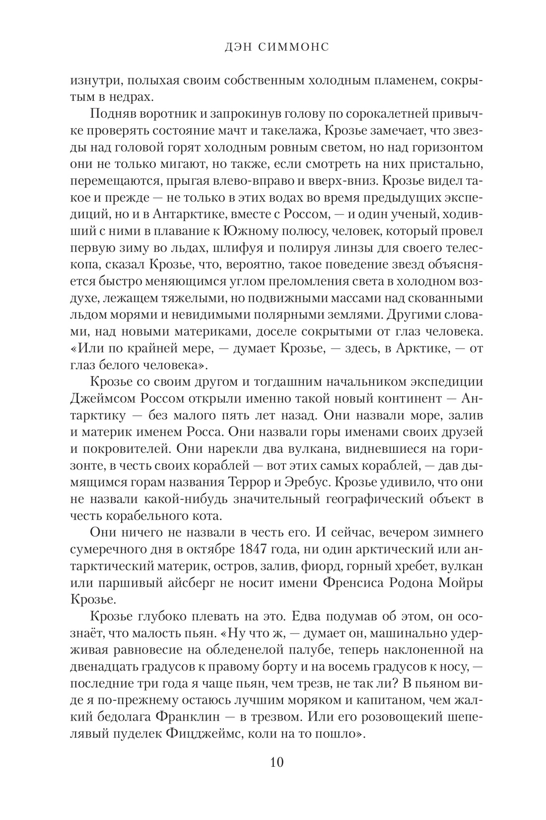 В 1845 году экспедиция под командованием опытного полярного исследователя сэра Джона Франклина отправляется на судах «Террор» и «Эребус» к северному побережью Канады на поиск Северо-Западного прохода из Атлантического океана в Тихий — и бесследно исчезает. Поиски ее затянулись на несколько десятилетий, сведения о ее судьбе собирались буквально по крупицам, и до сих пор картина происшедшего пестрит белыми пятнами — хотя осенью 2014 года грянула сенсация: после более чем полутора веков поисков «Эребус» был наконец обнаружен, и ученые уже готовятся приступить к изучению останков корабля, идеально сохранившихся в полярных водах. Но еще за несколько лет до этого поразительного открытия Дэн Симмонс, знаменитый автор «Гипериона» и «Эндимиона», «Илиона» и «Олимпа», «Песни Кали» и «Темной игры смерти», предложил свою версию событий: главную угрозу для экспедиции составляли не сокрушительные объятия льда, не стужа с вьюгой и не испорченные консервы — а неведомое исполинское чудовище, будто сотканное из снега и полярного мрака.