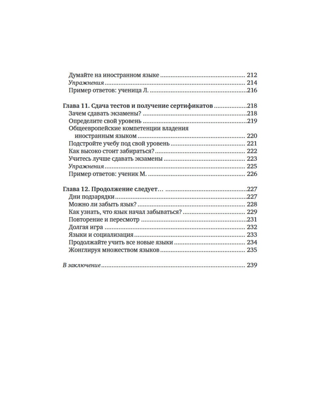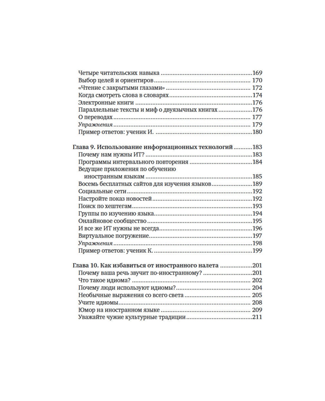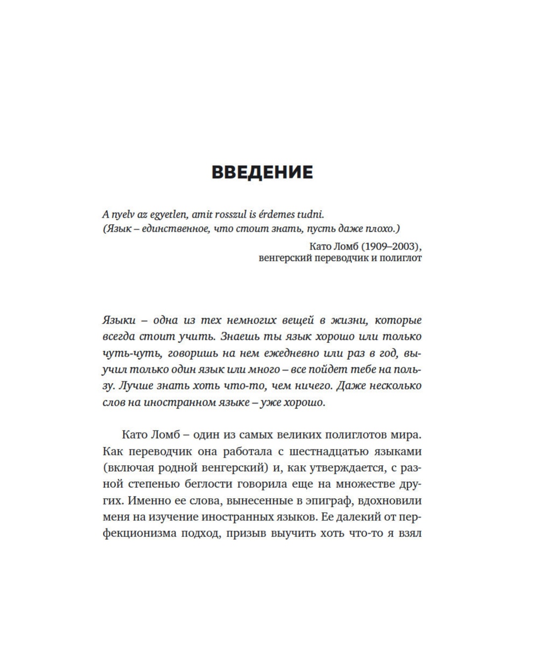 «Постижение нового языка – чрезвычайно захватывающий процесс, бесконечный источник увлекательных задач и разнообразных развлечений. Эта книга пригодится вам на любом его этапе: и в самом начале пути, когда вы только ищете свой подход, и в разгар учебы, когда вы обдумываете, как продвигаться вперед. Вы найдете в ней свежие идеи и неожиданные перспективы, а также описания различных приемов, которые – как показала практика – позволяют овладеть иностранным языком быстрее, легче и с большим удовольствием. Вы увидите, что язык можно изучать разными путями. Надеюсь, что книга поможет вам найти свой.