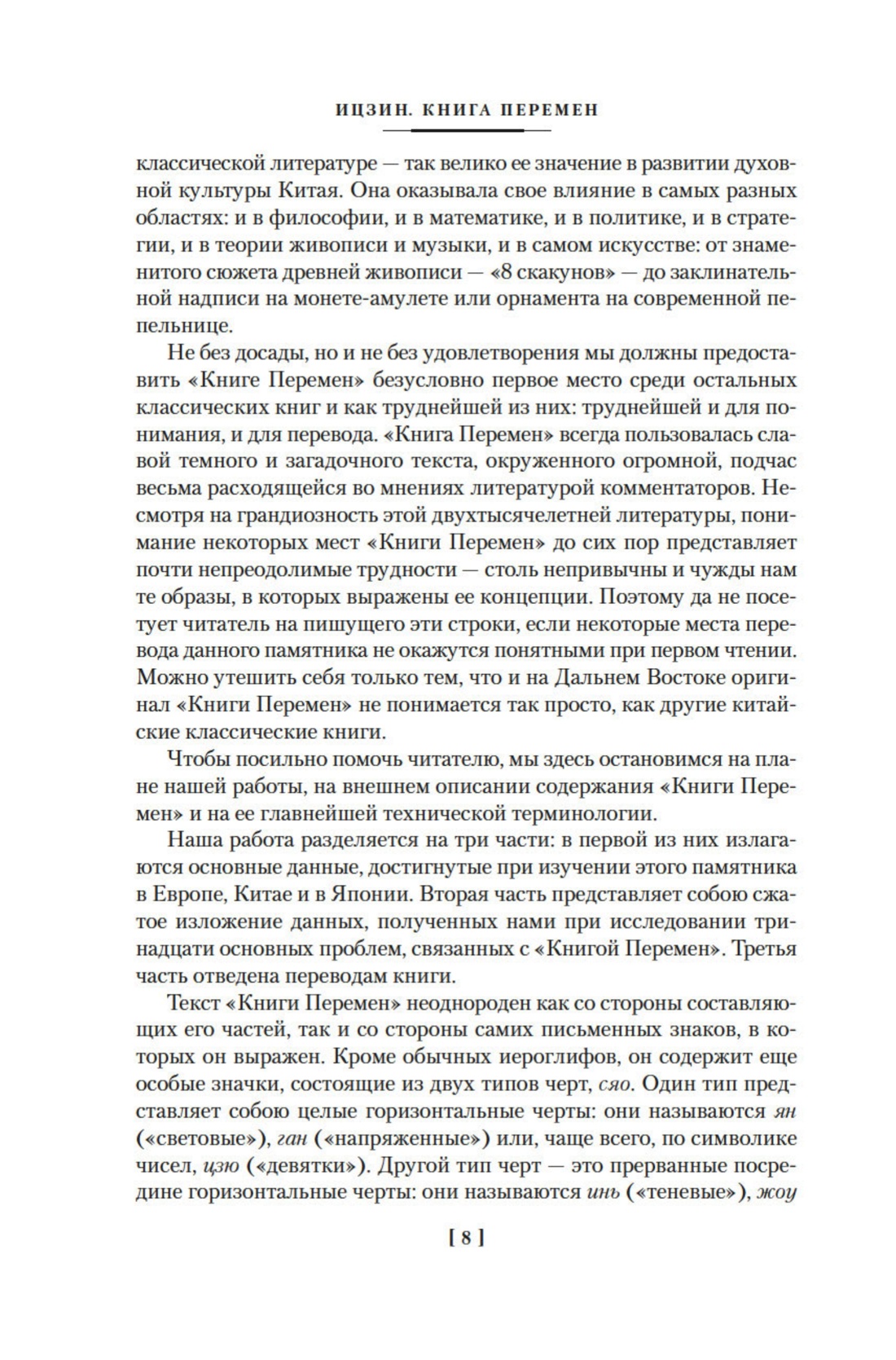 «Ицзин» («Книга Перемен») — одна из древнейших книг китайской цивилизации и, пожалуй, одна из самых знаменитых. В основе ее лежат 64 гексаграммы, особые символы, призванные очертить определенные жизненные ситуации и раскрыть вопрошающему их дальнейшее развитие. Однако значение и смысл «Книги Перемен» выходят далеко за рамки «предсказателя судьбы». Своей мудростью «Ицзин» вдохновляла многие поколения философов, писателей и прочих людей, пытающихся найти ответы на основополагающие вопросы жизни и приподнять завесу над тайной бытия. Влияние «Ицзин» на мировую культуру трудно переоценить, недаром Густав Юнг, написавший подробный комментарий к англоязычному изданию, назвал ее мудрейшей из всех книг.