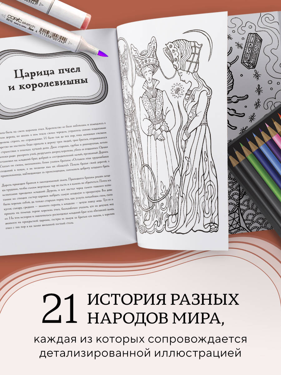 Вы наверняка знаете, в чем виновата Пандора и сколько желаний можно попросить у джина, но эта раскраска познакомит вас и с такими удивительными мифами, легендами и сказками, как история про джекалопа или Бай Цзэ, расскажет вам про цзянши и урмалуллу. Каждая иллюстрация сопровождается историей, чтобы вы могли узнать героев, злодеев и загадочных существ лучше.