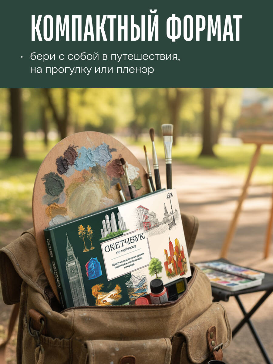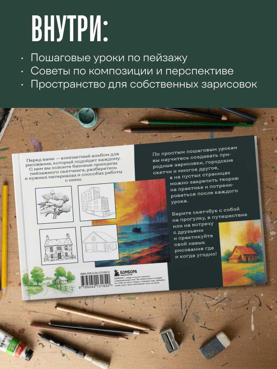 Скетчбук по пейзажу — удобный и компактный самоучитель для начинающих художников. С его помощью вы сможете освоить базу скетчинга и сделать свои первые самостоятельные шаги в рисовании. Подробные поэтапные мастер-классы просто и доступно покажут, как рисовать с натуры. Вы разберете, что такое композиция, как с ней работать, как строить перспективу и делать зарисовки как природы, так и города. А на пустых страницах можно закрепить полученные знания и сделать свои первые скетчи. Благодаря небольшому размеру скетчбук можно брать с собой в поездки или прогулки в парке, чтобы практиковаться каждый день.