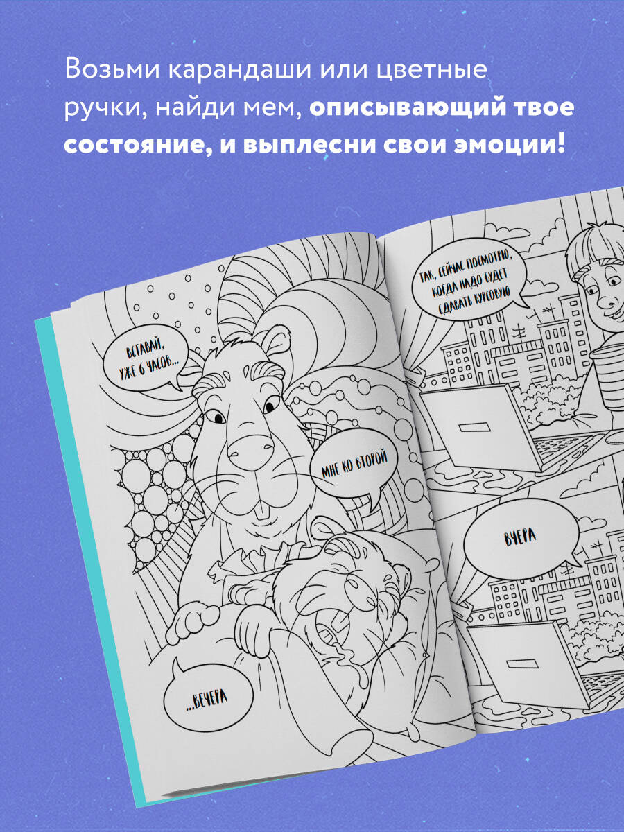 Перед тобой необычная раскраска-антистресс! Если тебя достали однокурсники и хочется расслабиться после учебного дня, то эта раскраска прекрасно подойдет! Возьми свои любимые карандаши или цветные ручки, найди мем, наиболее полно описывающий твое состояние, и выплесни свои эмоции! Отвлекись от внешнего мира, раскрашивая капибар и обезьянок в жизненных ситуациях из известных мемов!