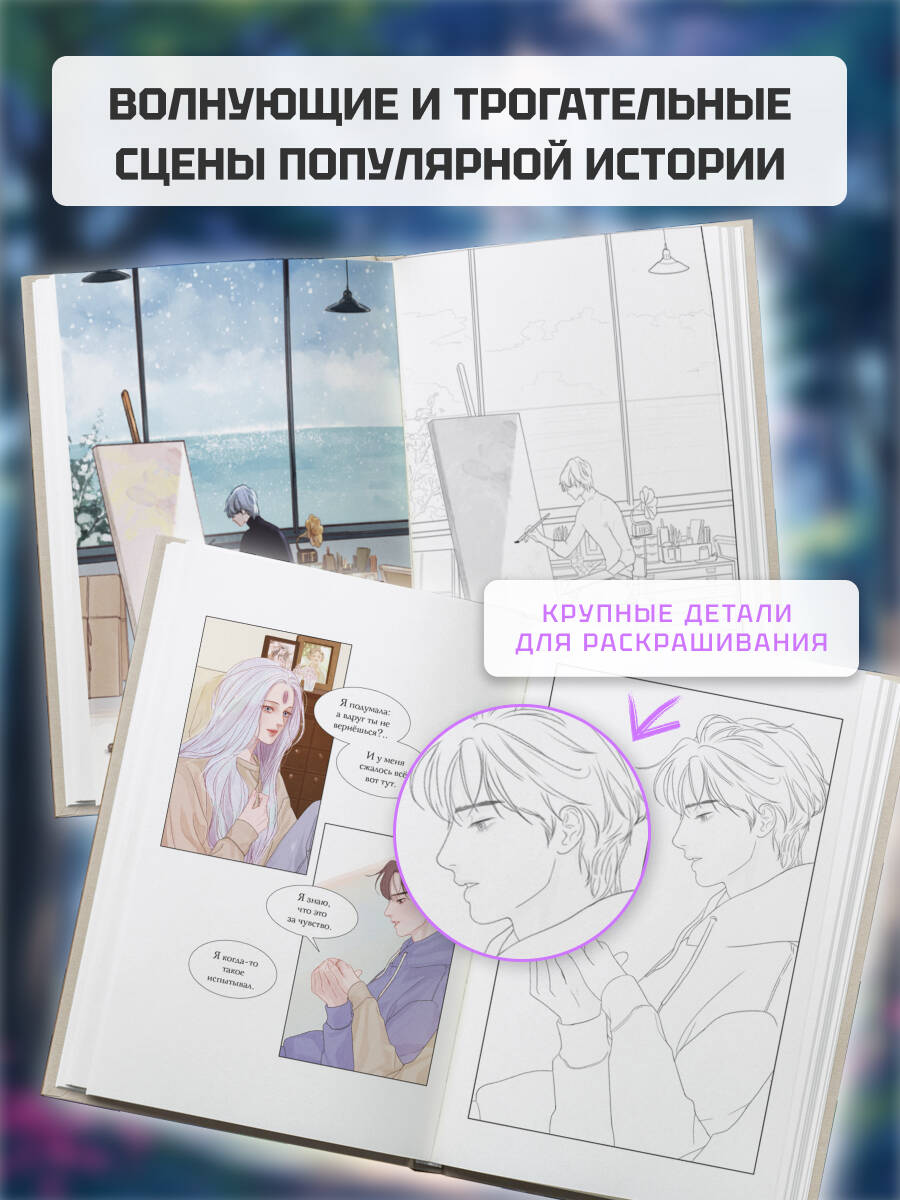 Эта раскраска станет отличным подарком фанатам вебтунов и просто приятным приобретением для себя. Крупные изображения и плотная бумага позволят полностью погрузиться в вымышленный мир и с удовольствием провести время.