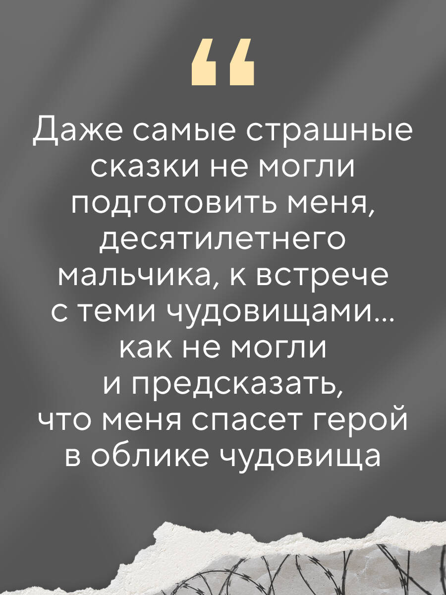 «Даже самые страшные сказки не могли подготовить меня, десятилетнего мальчика, к встрече с теми чудовищами… как не могли и предсказать, что меня спасет герой в облике чудовища».