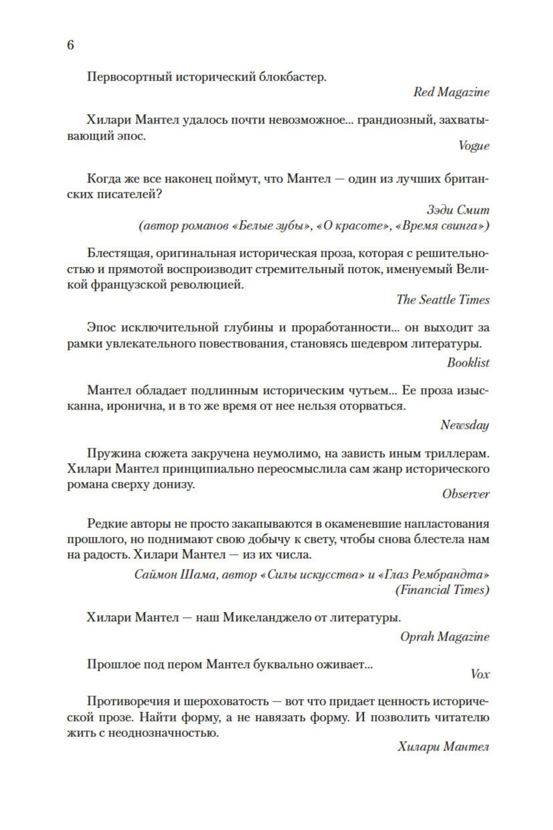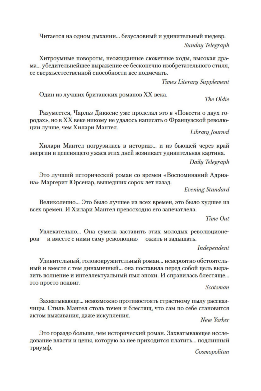 «Я стала писательницей исключительно потому, что упустила шанс стать историком… Я должна была рассказать себе историю французской революции, однако не с точки зрения ее врагов, а с точки зрения тех, кто ее совершил. Полагаю, эта книга всегда была для меня важнее всего остального… думаю, что никто, кроме меня, так не напишет. Никто не практикует этот метод, это мой идеал исторической достоверности» (Хилари Мантел).