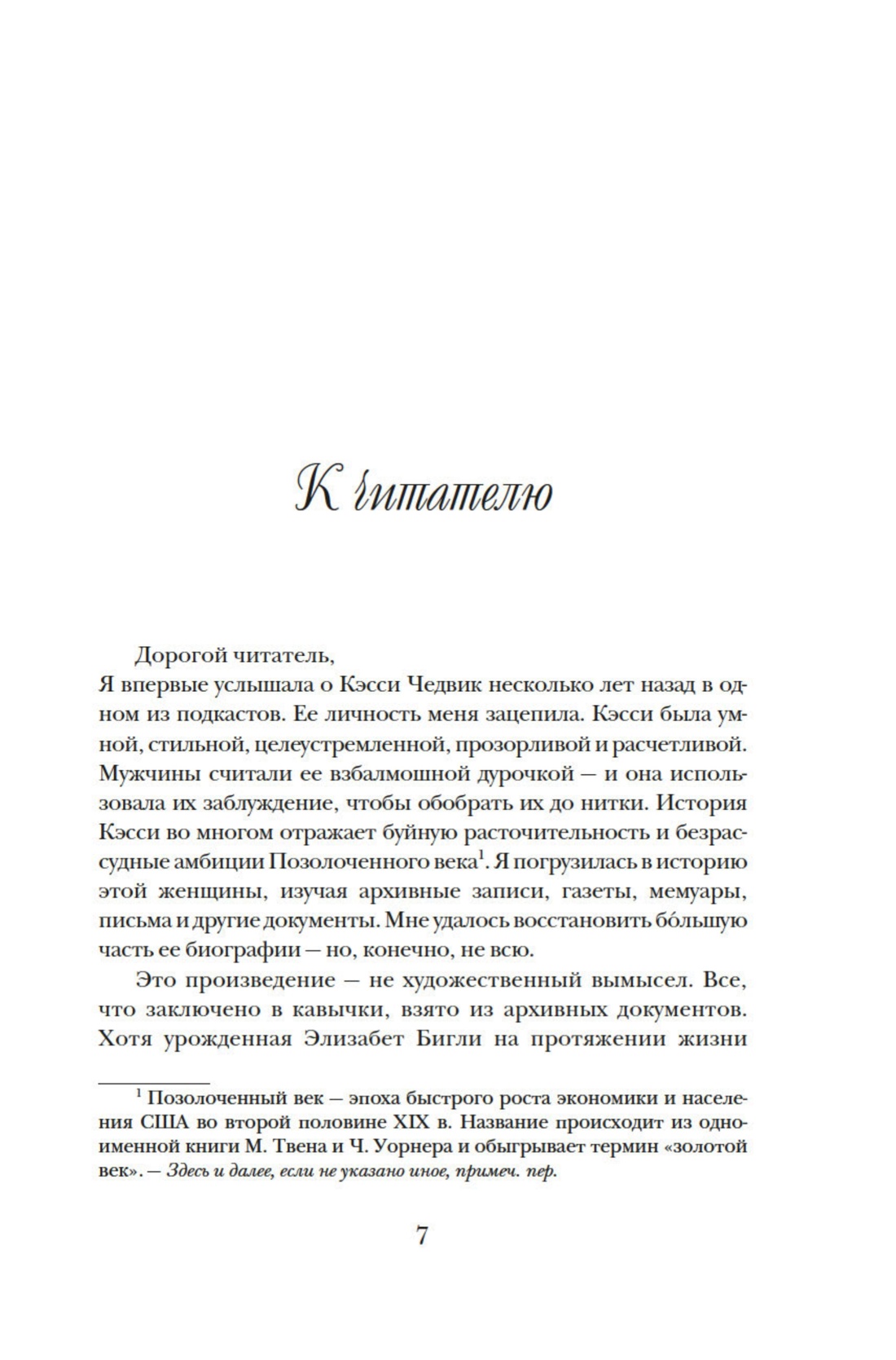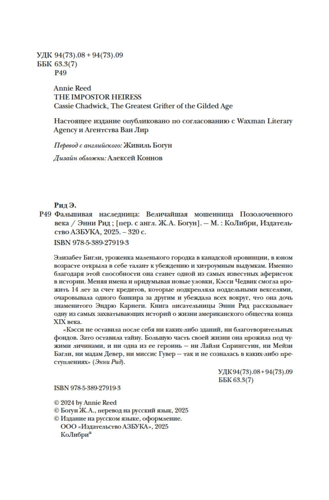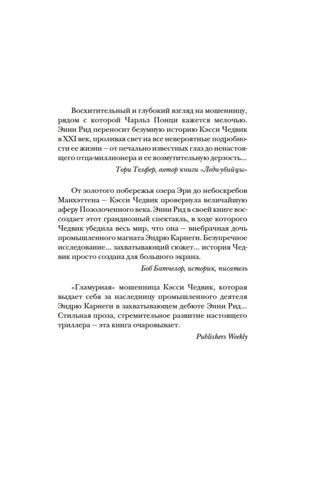 Элизабет Бигли, уроженка маленького городка в канадской провинции, в юном возрасте открыла в себе талант к убеждению и хитроумным выдумкам. Именно благодаря этой способности она станет одной из самых известных аферисток в истории. Меняя имена и придумывая новые уловки, Кэсси Чедвик смогла прожить 14 лет за счет кредитов, которые подкрепляла поддельными векселями, очаровывала одного банкира за другим и убеждала всех вокруг, что она дочь знаменитого Эндрю Карнеги. Книга писательницы Энни Рид рассказывает одну из самых захватывающих историй о жизни американского общества конца XIX века.