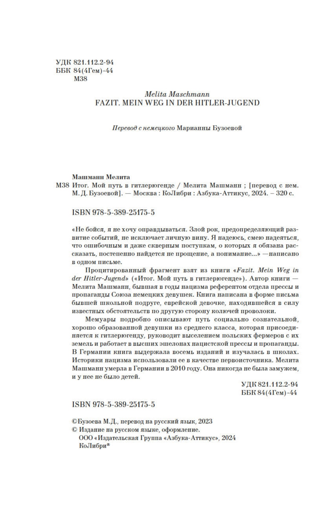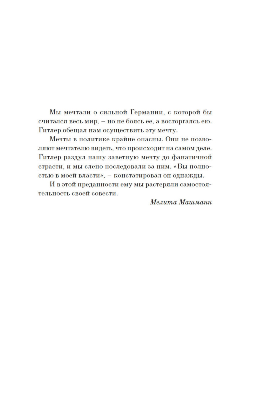 Процитированный фрагмент взят из книги «Fazit. Mein Weg in der Hitler-Jugend» («Итог. Мой путь в гитлерюгенде»). Автор книги — Мелита Машманн, бывшая в годы нацизма референтом отдела прессы и пропаганды Союза немецких девушек. Книга написана в форме письма бывшей школьной подруге, еврейской девочке, находившейся в силу известных обстоятельств по другую сторону колючей проволоки.