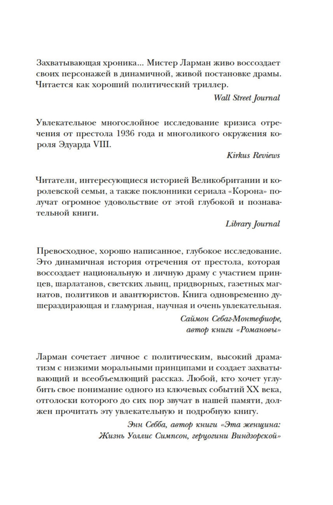 «До Эдуарда VIII на троне восседали самые разные монархи: гнусные и героические, невежественные, тщеславные и святые. Но история еще не знала короля, отринувшего корону ради брака» (Александр Ларман).