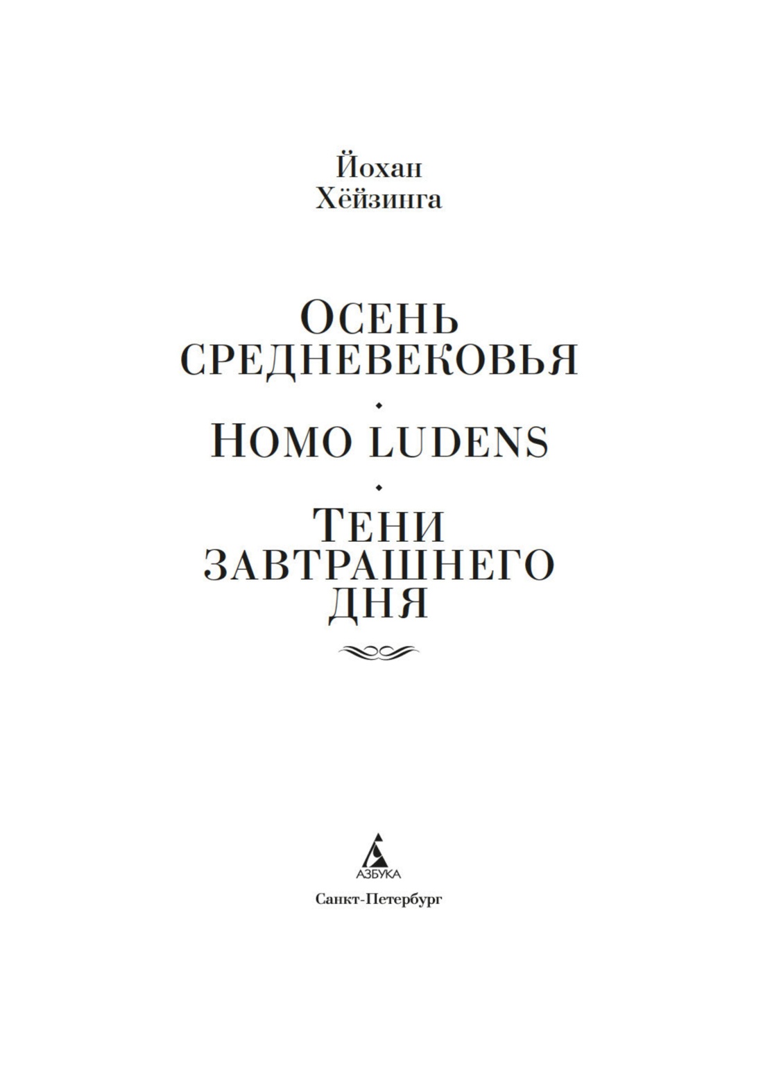 Сборник включает наиболее значительные произведения выдающегося нидерландского историка и культуролога Йохана Хёйзинги (1872–1945). «Осень Средневековья» — поэтическое описание социокультурного феномена позднего Средневековья, яркая, насыщенная энциклопедия жизни, искусства, культуры Бургундии XIV–XV вв. «Homo ludens» — фундаментальное исследование игрового характера культуры, провозглашающее универсальность феномена игры. В «Тенях завтрашнего дня» (1935) глубоко анализируются причины и следствия духовного обнищания европейской цивилизации в преддверии Второй мировой войны; этот очерк называли ключом к творчеству и к личности Йохана Хёйзинги. Доклад «Человек и культура», подготовленный для выступления в Австрии в мае 1938 г. и не прочитанный из-за вступления туда в марте немецких войск, провозглашает нерасторжимость личности и культуры и представляет несомненную ценность как выразительное и лаконичное изложение взглядов Хёйзинги на суть обозначенной им проблемы.