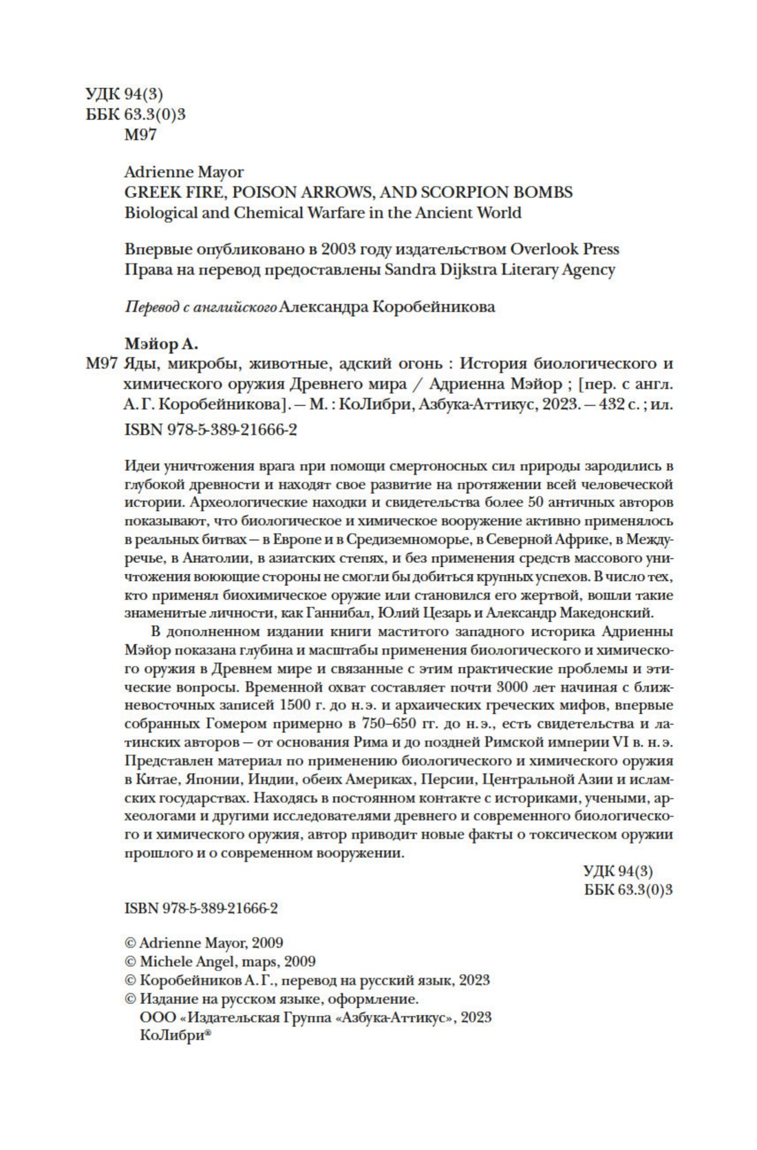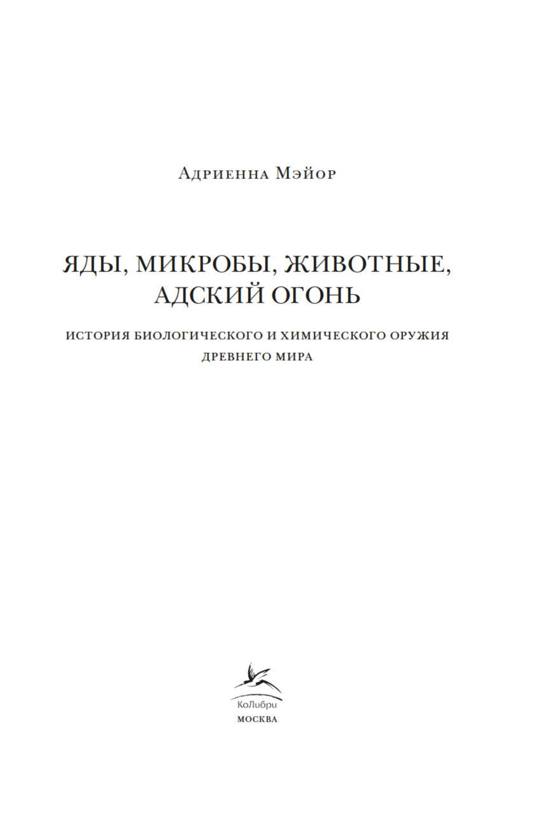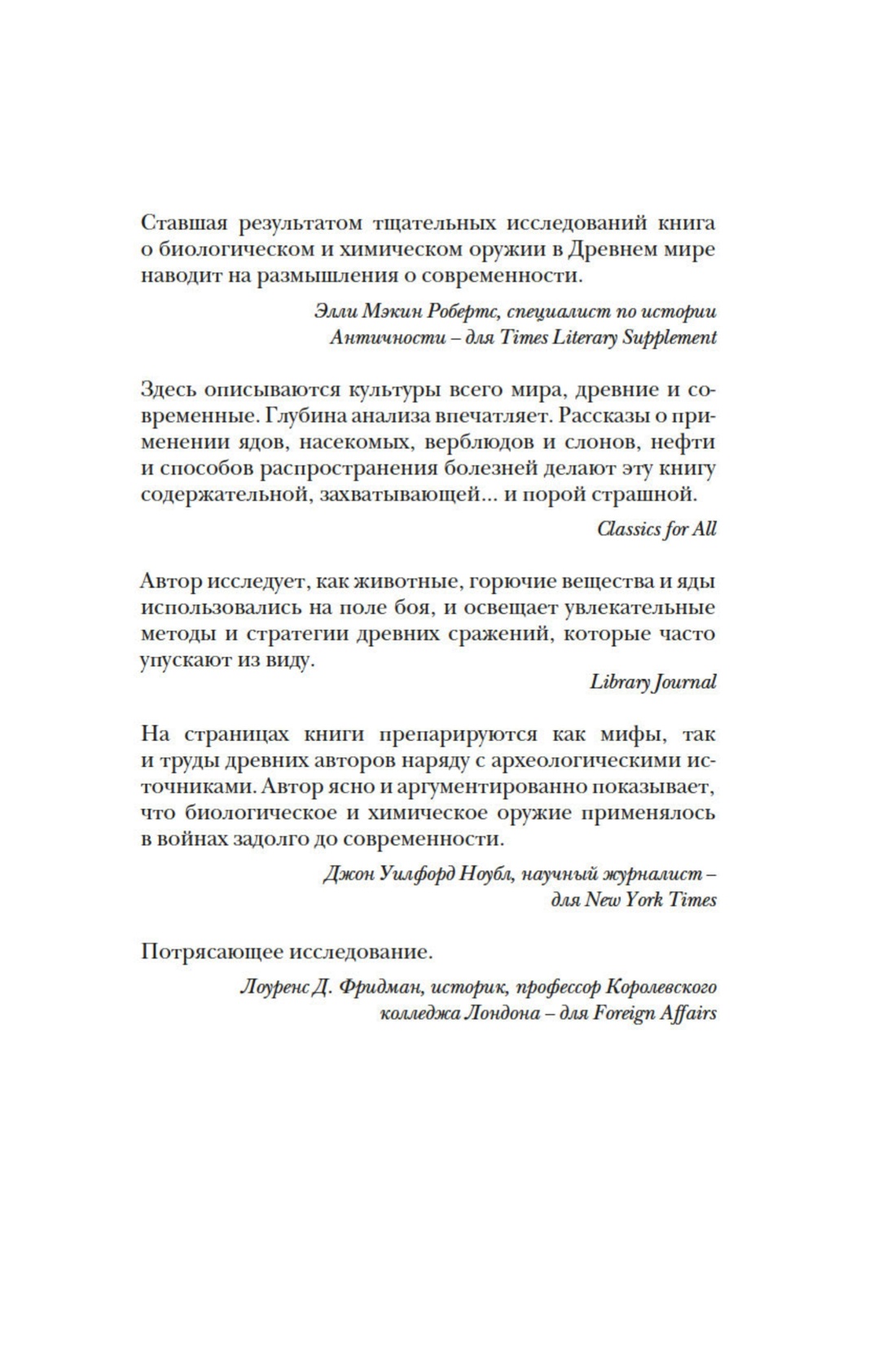 В дополненном издании книги маститого западного историка Адриенны Мэйор показана глубина и масштабы применения биологического и химического оружия в Древнем мире и связанные с этим практические проблемы и этические вопросы. Временной охват составляет почти 3000 лет начиная с ближневосточных записей 1500 г. до н. э. и архаических греческих мифов, впервые собранных Гомером примерно в 750–650 гг. до н. э., есть свидетельства и латинских авторов — от основания Рима и до поздней Римской империи VI в. н. э. Представлен материал по применению биологического и химического оружия в Китае, Японии, Индии, обеих Америках, Персии, Центральной Азии и исламских государствах. Находясь в постоянном контакте с историками, учеными, археологами и другими исследователями древнего и современного биологического и химического оружия, автор приводит новые факты о токсическом оружии прошлого и о современном вооружении.