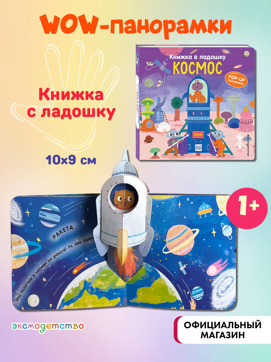 Хочешь полететь в космос на настоящей ракете? А познакомиться с дружелюбными инопланетянами? А может, прогуляться по Луне? Тогда приготовься к космическому путешествию! На каждой странице этой книги тебя ждут объёмные элементы и pop-up панорамки. Играй с подвижными деталями и развивай мелкую моторику! А ещё узнай интересные факты про космос в интерактивной книжке для самых маленьких.