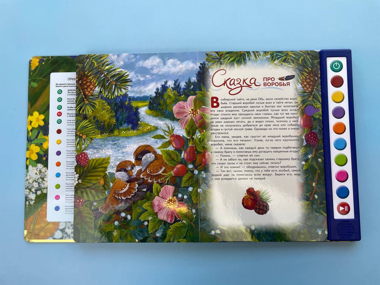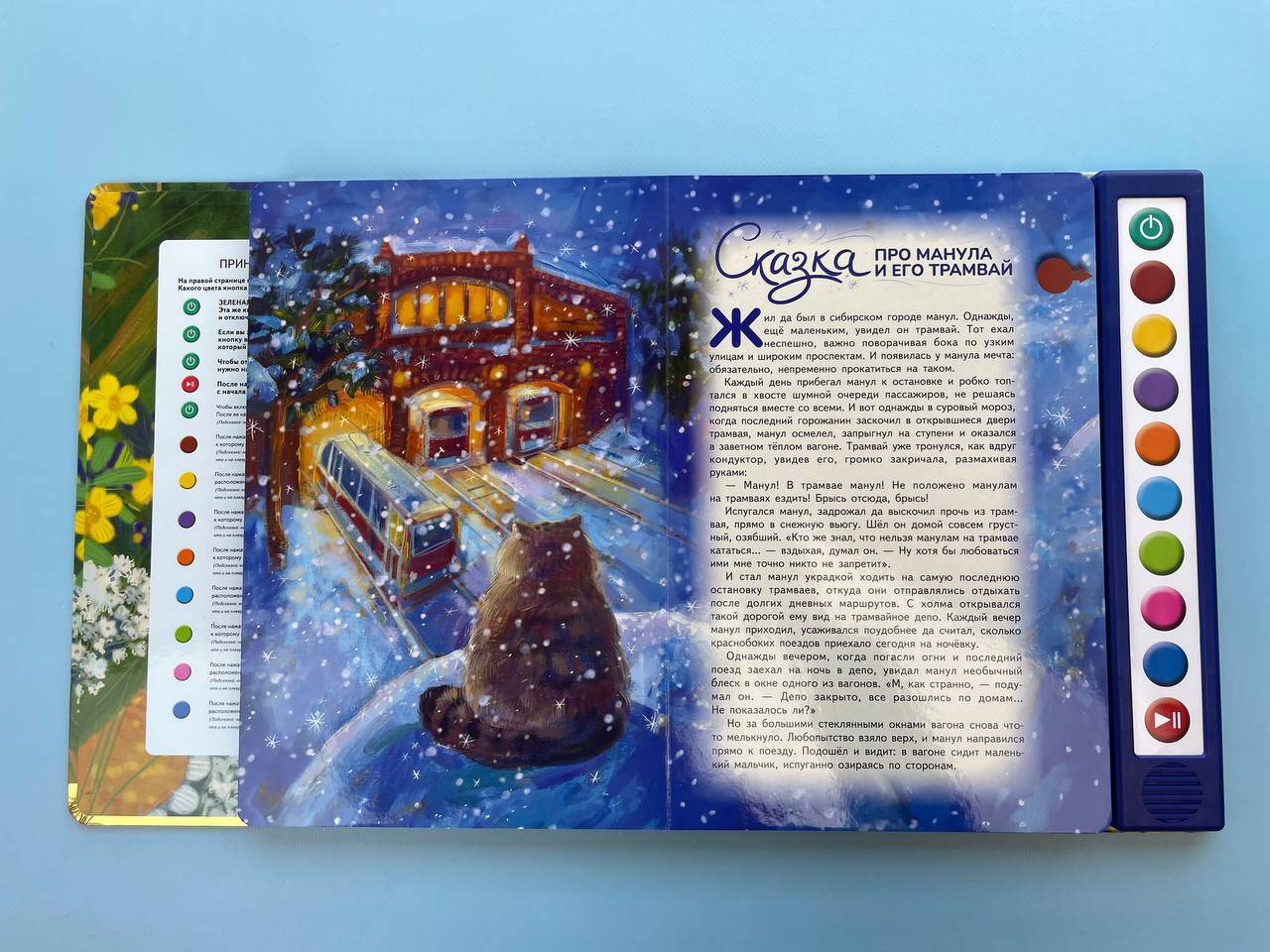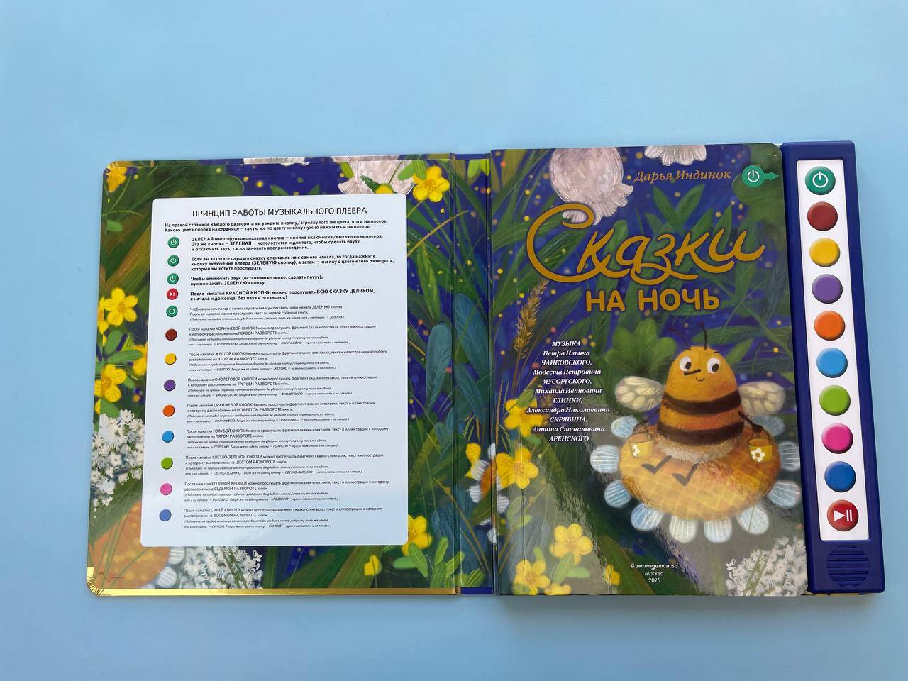 Музыкальная книга-плеер — прекрасное сочетание традиционной книги и современных технологий. Сборник сказок современного автора Дарьи Индинок для малышей и их родителей: добрые истории о дружбе, заботе, внимании, которые так приятно читать перед сном. Красочное иллюстрированное издание дополнено звуковым плеером, который работает от двух батареек типа ААА. Яркие, крупные кнопки на панели модуля позволяют прослушать сказки как по отдельности, так и всю книгу полностью, от начала до конца, а также сделать паузу в прослушивании. Время звучания всех сказок — 22 минуты! Наша книга — это идеальный вариант «сказки на ночь»: пока ребёнок слушает книгу и засыпает, взрослые могут заняться своими делами. Каждая строчка книги-аудиоспектакля, озвученная профессиональными чтецами, сопровождается шедеврами отечественной классики — музыкой Чайковского, Мусоргского, Глинки и т.д.