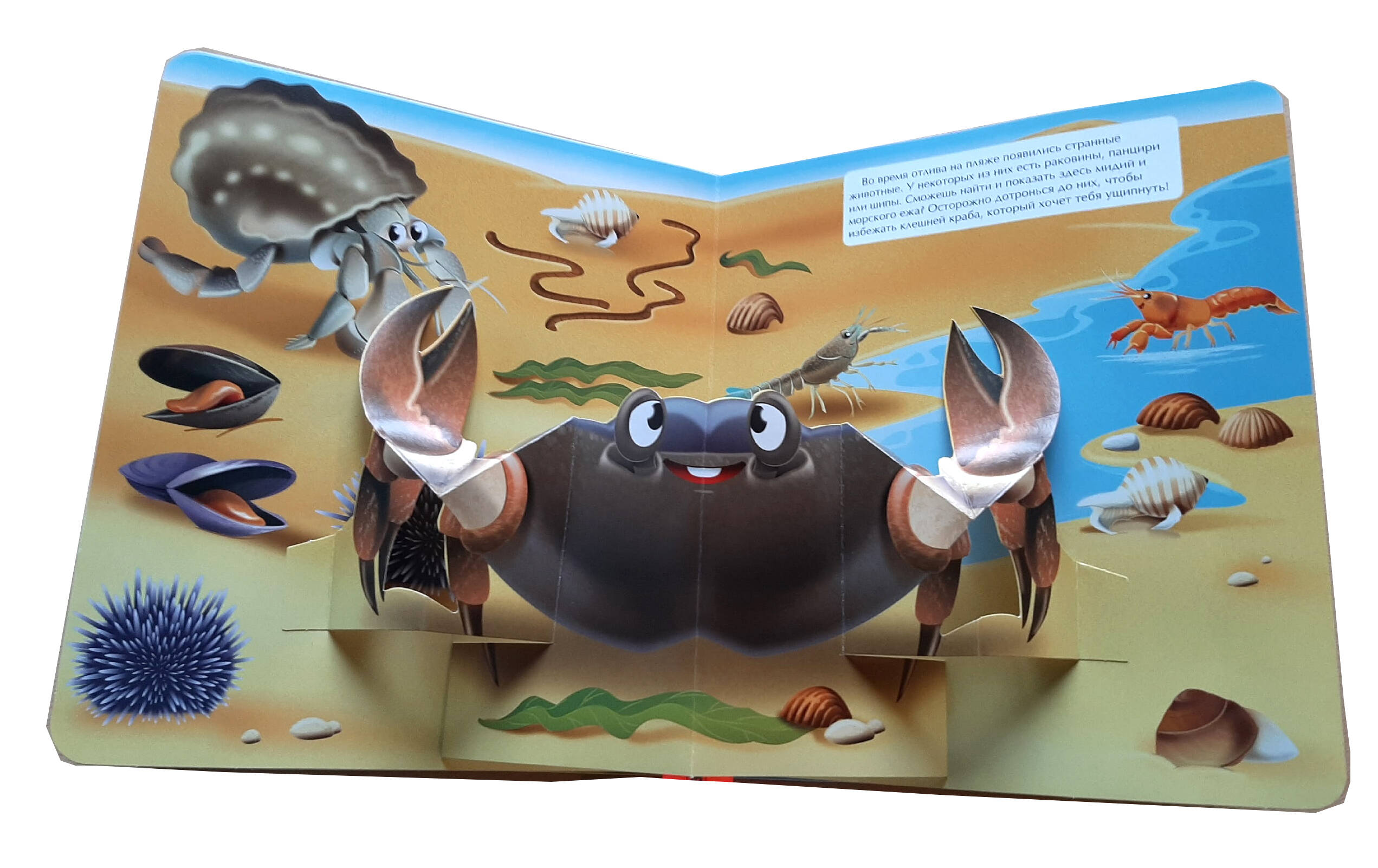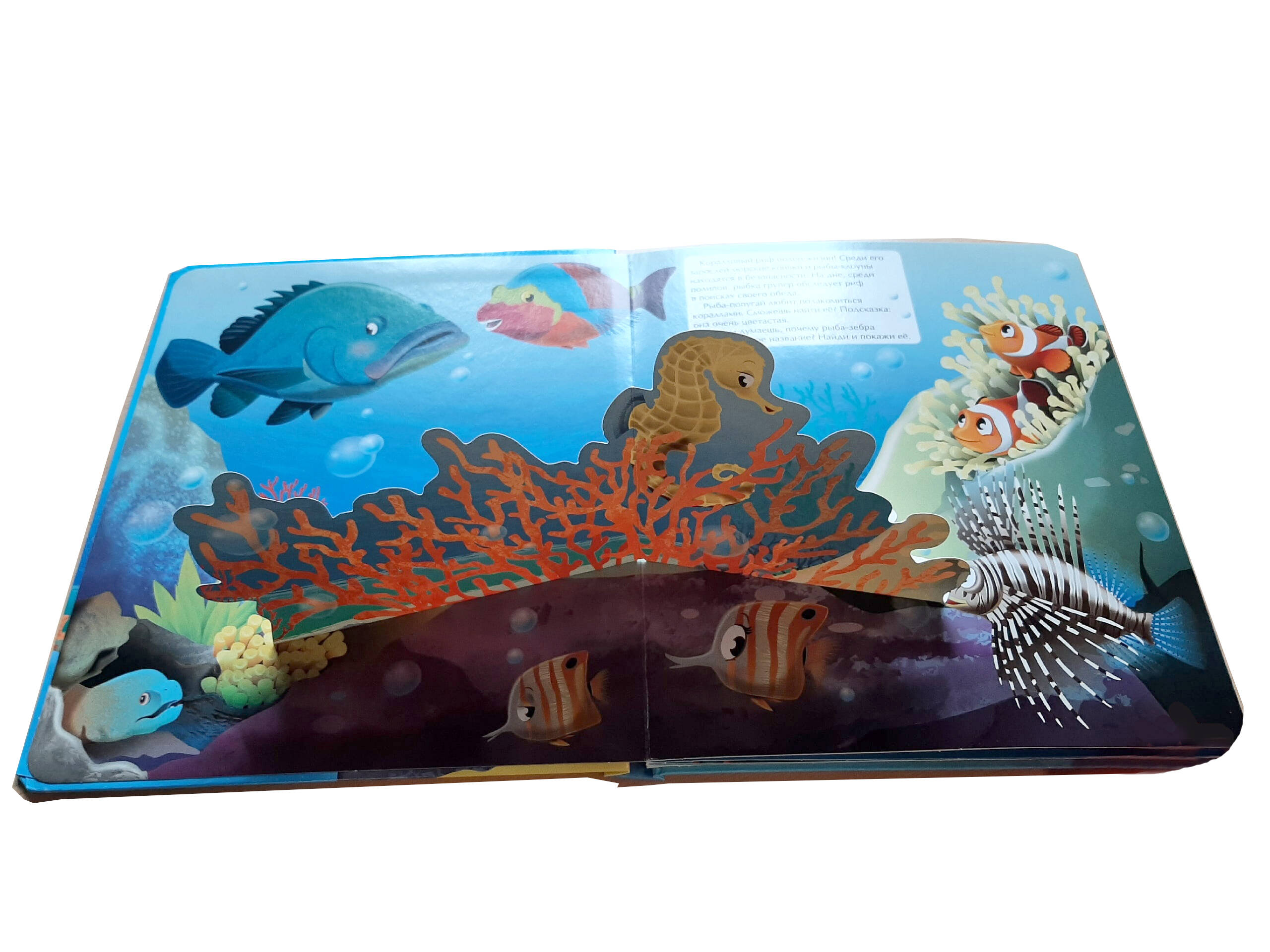 Это красочная и весёлая книга, посвящённая морским животным. На каждой странице сюрприз — объёмный панорамный элемент, благодаря которому иллюстрация оживает.