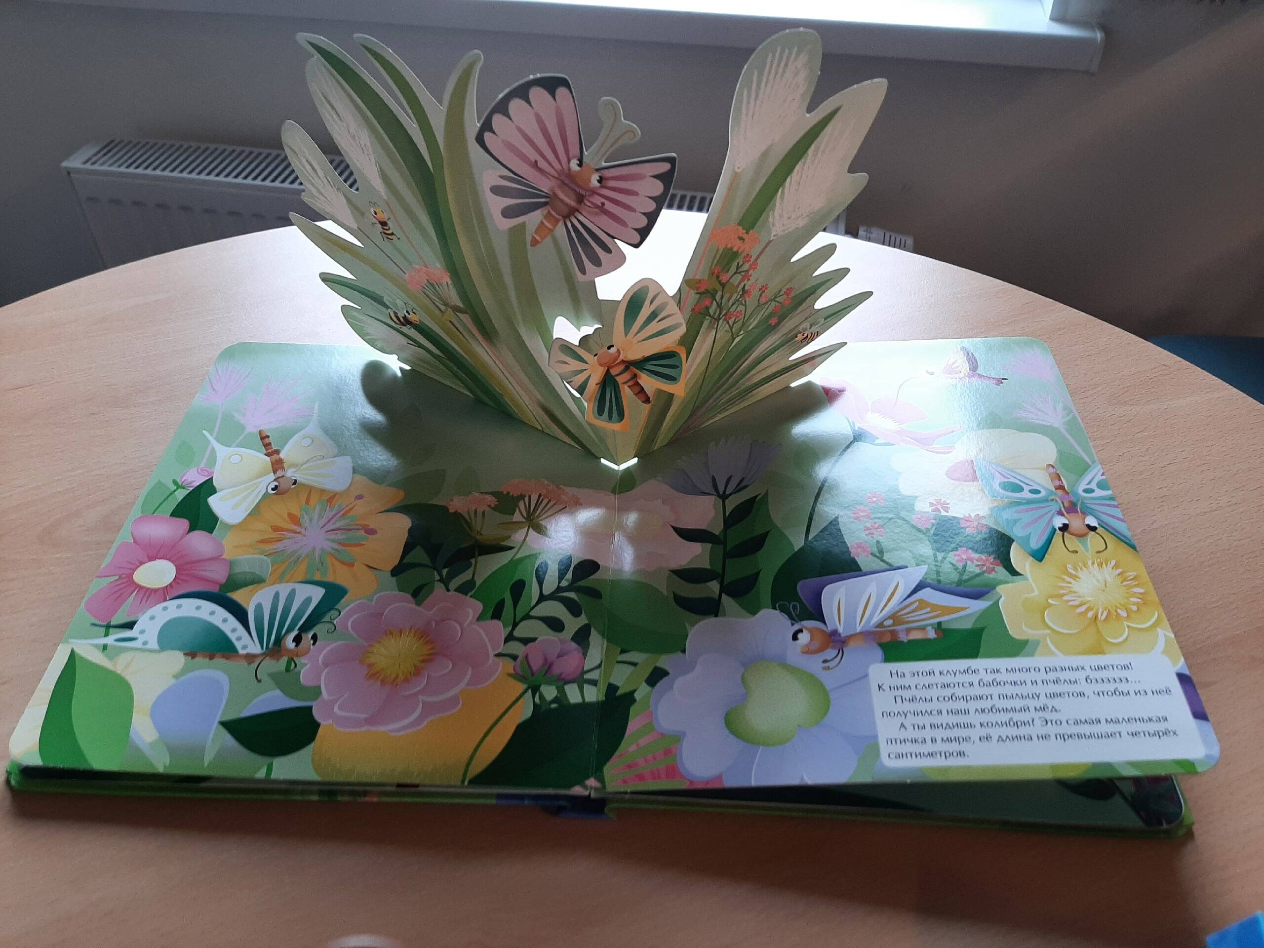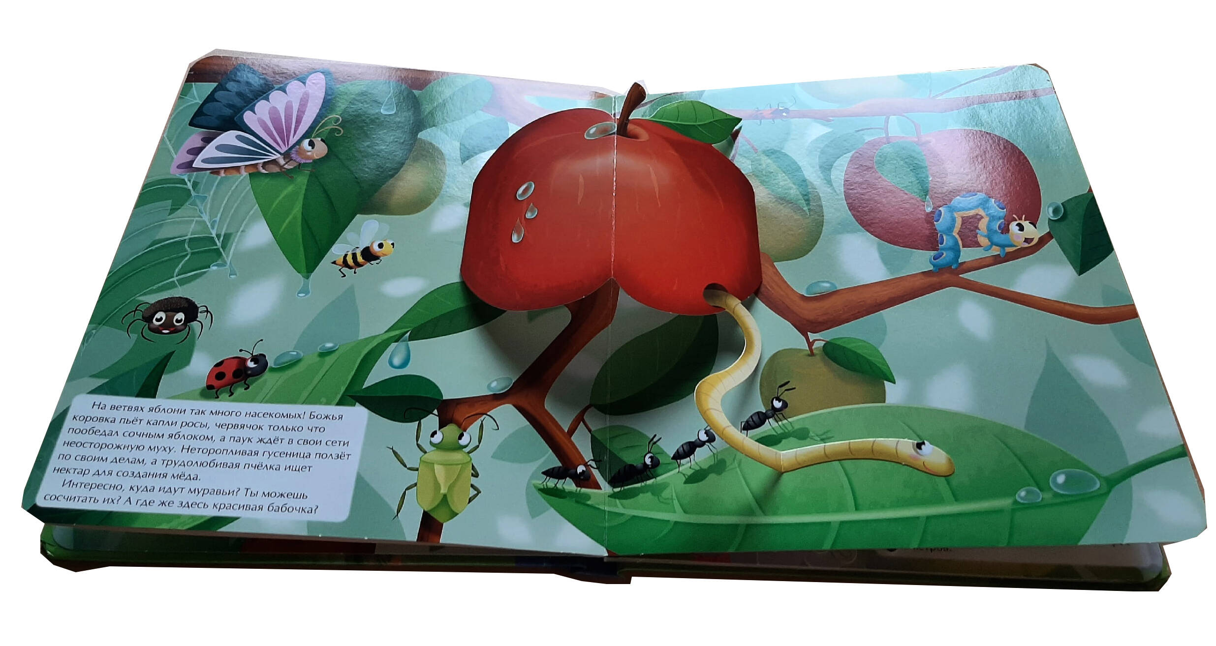 Это красочная и весёлая книга, посвящённая саду и его обитателям. На каждой странице сюрприз — объёмный панорамный элемент, благодаря которому иллюстрация оживает.