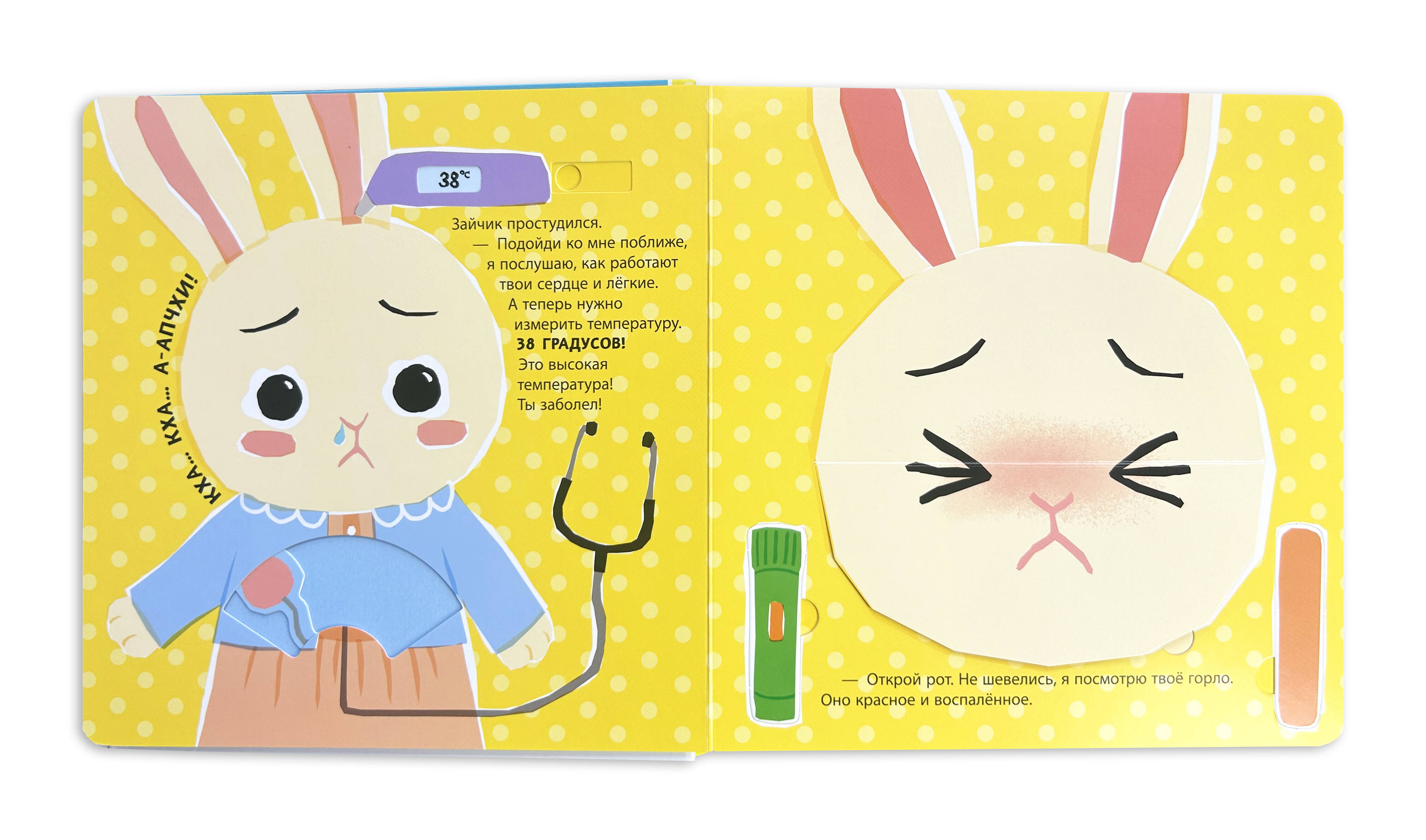Маленький зайчик заболел. Измерь ему температуру, сделай укол, рентген и ингаляцию, напои лекарством и уложи малыша спать. Все необходимые процедуры ты сможешь выполнить прямо в этой книжке, благодаря подвижным элементам!
