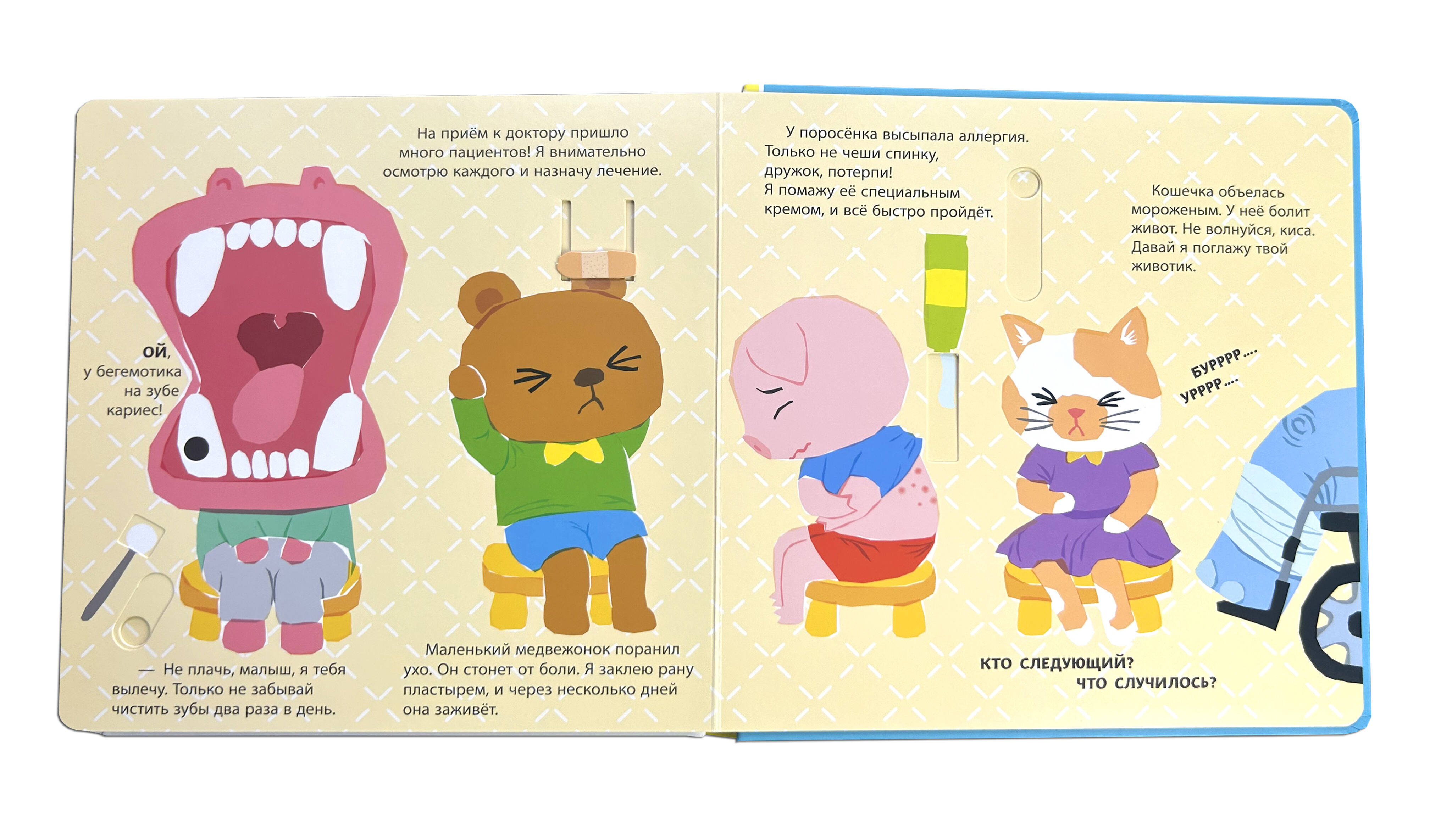 Хочешь лечить зверят, как настоящий доктор? Тогда открывай книжку-игрушку, бери разложенные на страничках медицинские инструменты и принимайся за дело!