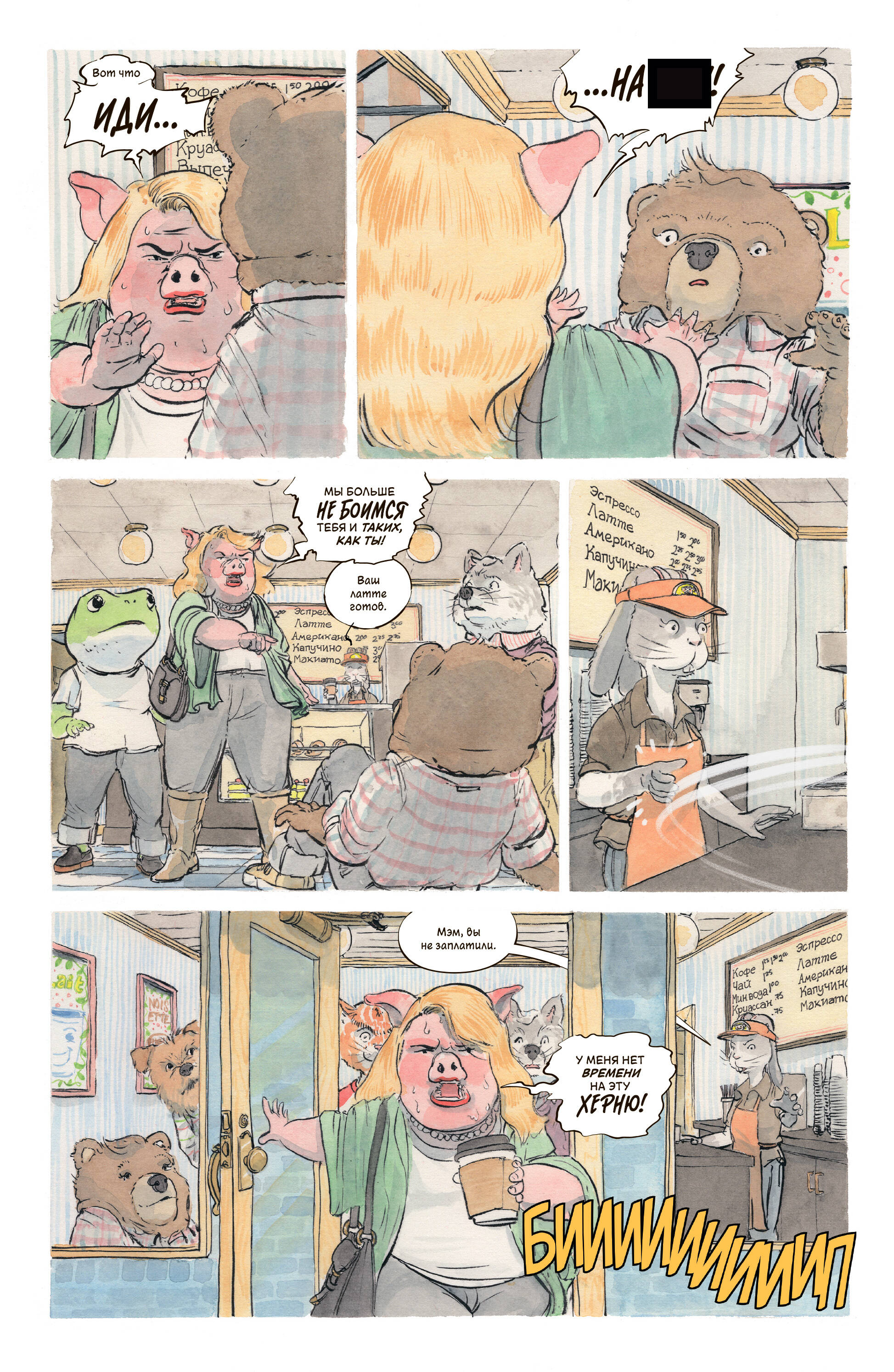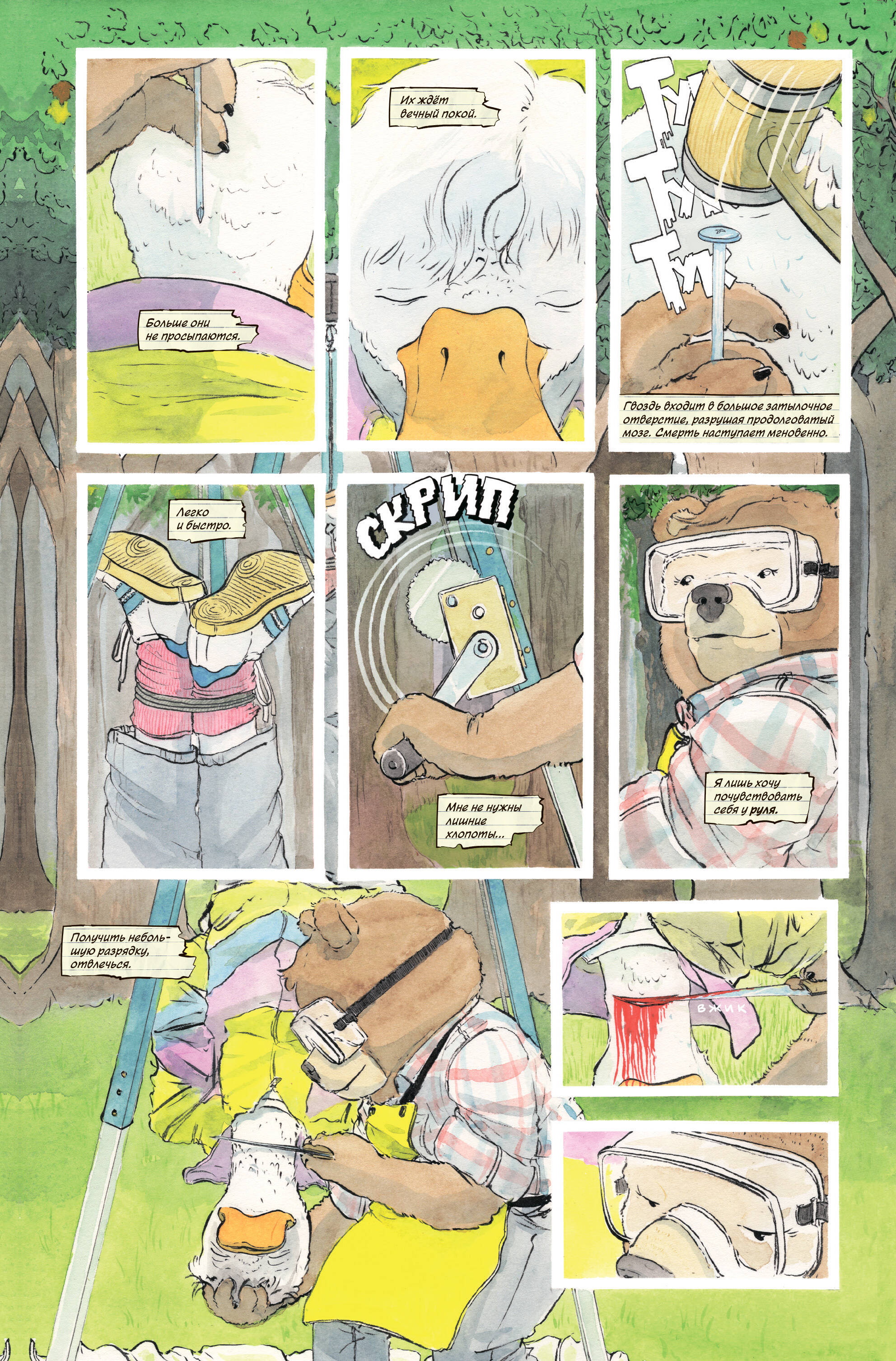 «Брутальная и интересная история, почти нуар. А графика в стиле детской книги создает контраст с мрачным содержанием, что завораживает и не позволяет оторваться до последней страницы».