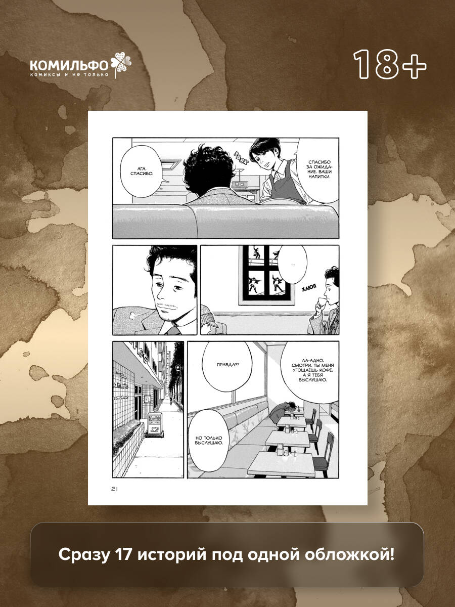 Его герои — патологический лжец из Италии, уличная виолончелистка, разочаровавшийся в людях детектив, обернувшиеся врагами товарищи-якудза, неудачливый владелец кофейни-книжной и многие другие. 17 историй под одной обложкой — горьких и терпких, насыщенных и бодрящих, как чашечка вашего любимого кофе.