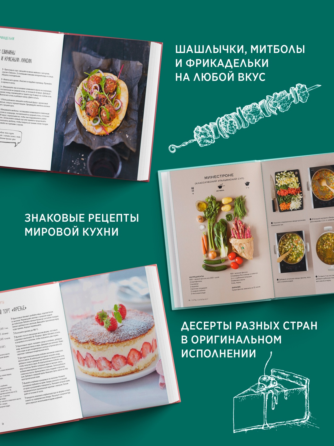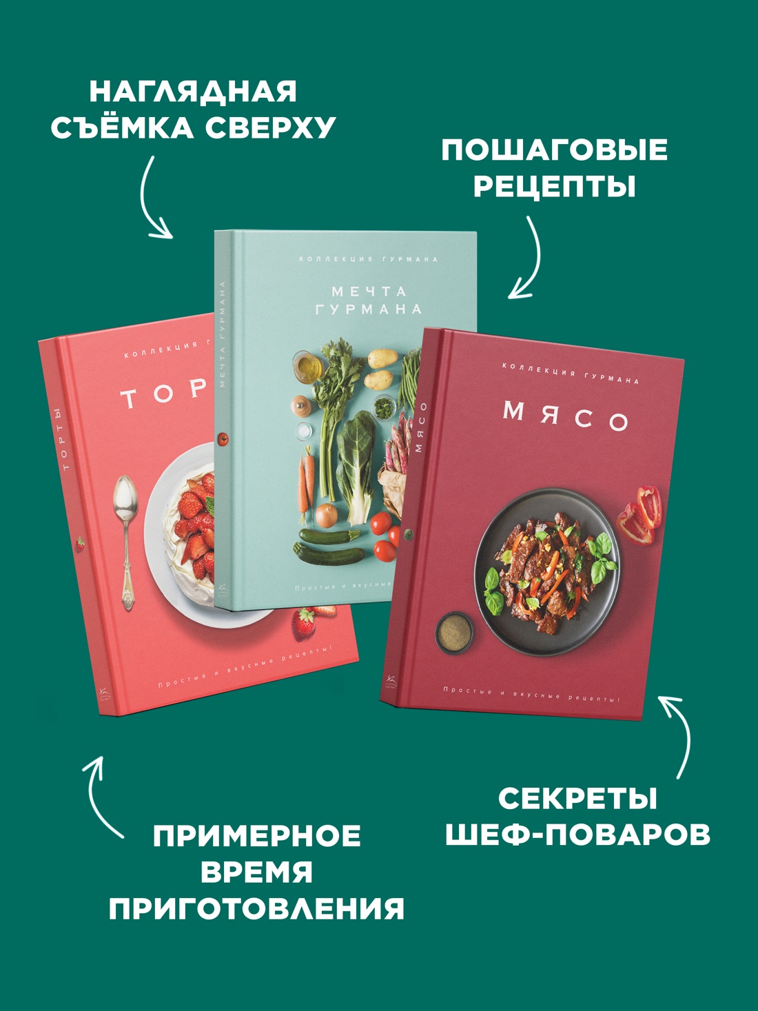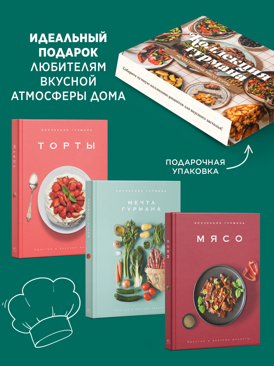 Соберите лучшую коллекцию рецептов для вкусного застолья! Внутри вы найдете блюда, идеально подходящие как для больших посиделок, так и для вашего личного ужина. «Мечта гурмана» погрузит вас в мир высокой кухни благодаря изысканным рецептам и красивым фотографиям. С помощью книги «Мясо» вы сможете приготовить не только вкуснейшие фрикадельки, митболы и шашлычки. но и неожиданные соусы и маринады для них. А в завершение пира порадовать себя шифоновым, лимонно-миндальным или королевским тортом, рецепты которых вы найдете в книге «Торты».