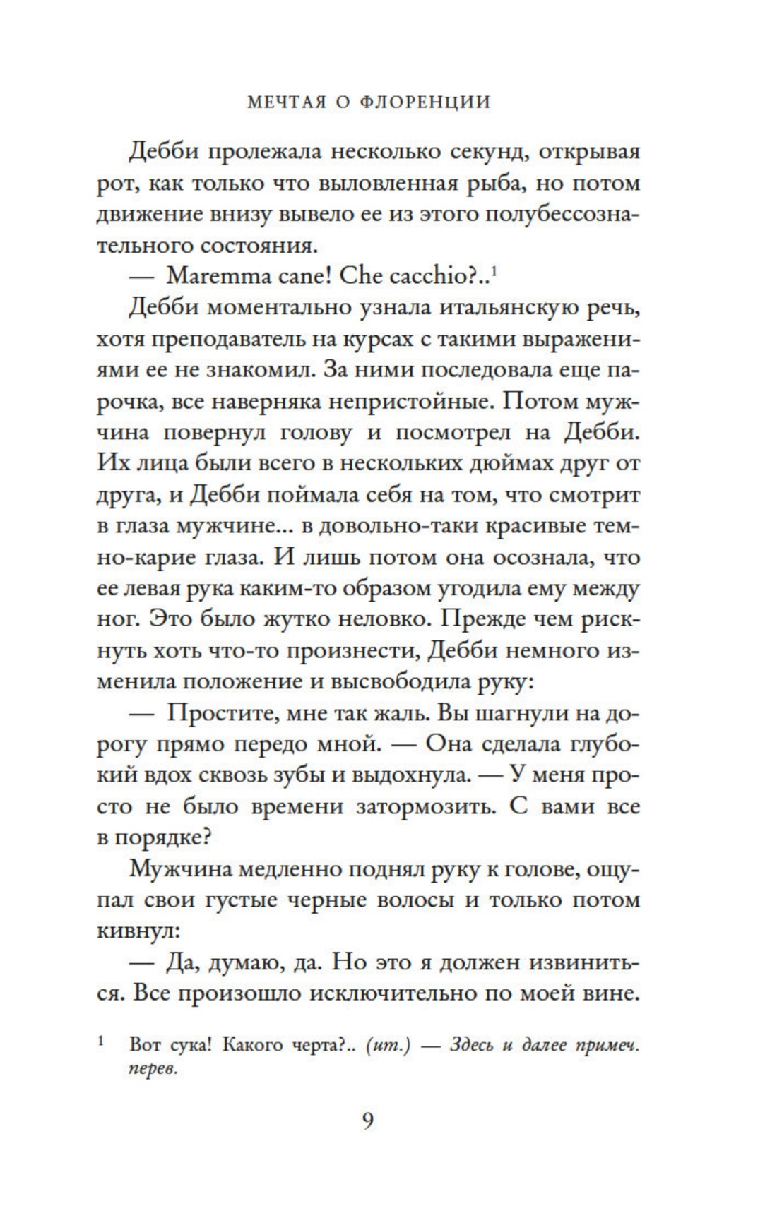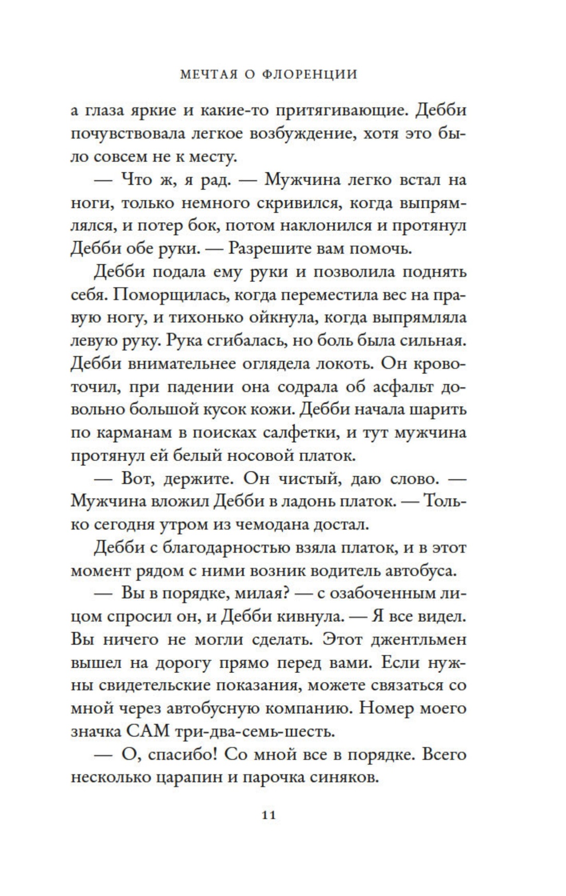 Возвращаясь с работы домой на велосипеде, Дебби случайно сбивает с ног прохожего. К счастью, обошлось без серьезных последствий, если не считать таковыми знакомство, подарок в виде нового велосипеда и приглашение на ужин. Дебби, скромная преподавательница английского языка в Кембридже, очарована красивым и обходительным итальянцем Пьерлуиджи и его рассказами о родной Флоренции — городе ее мечты. Что, если это знак судьбы и после долгого одиночества Дебби наконец встретила мужчину, о котором мечтала? Однако вскоре Пьерлуиджи вынужден уехать обратно на родину. Короткий роман завершен, но желание увидеть Флоренцию (и, может быть, своего возлюбленного) не покидает Дебби — и вот она на берегах Арно, под роскошным флорентийским небом, и будь что будет, ведь мечта уже наполовину сбылась...