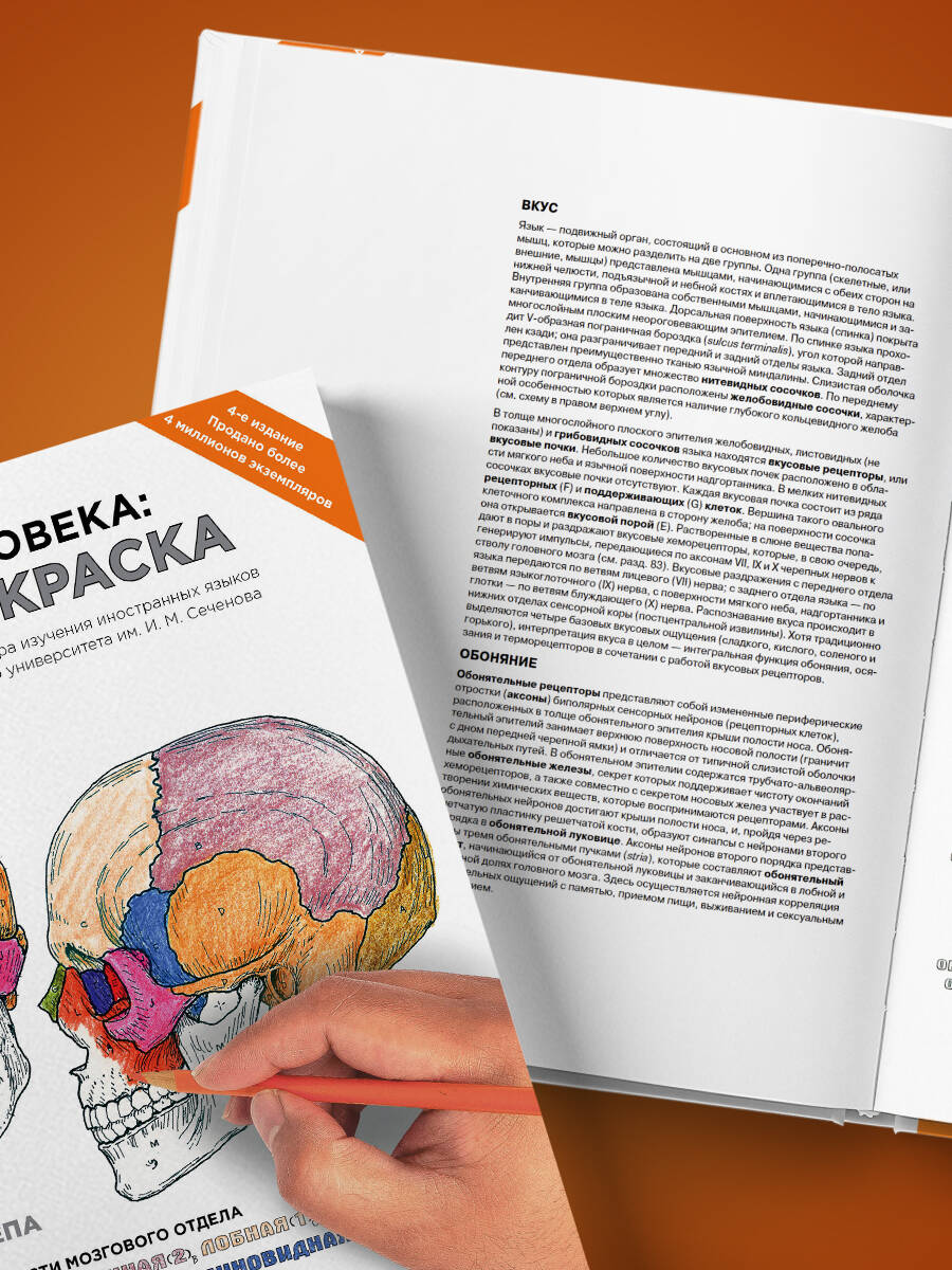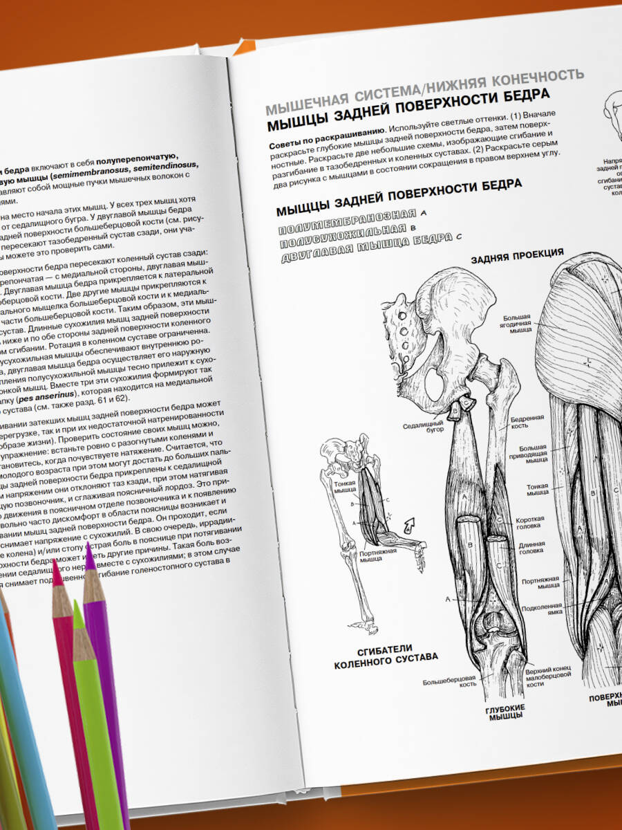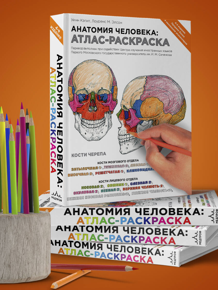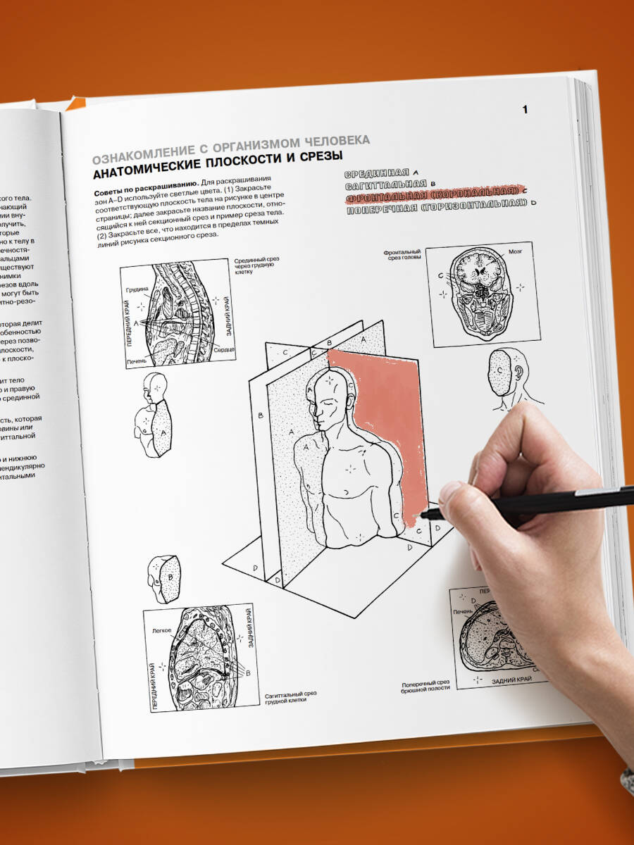 Ответ прост, как сама книга: это первый практический атлас анатомии человека. Он содержит специально прорисованные схемы. Все системы и органы до мельчайших деталей подписаны, а также при помощи простой буквенно-цифровой системы связаны с названиями. Раскрасьте их — и вы создадите свой атлас, параллельно же весело проведете время и выучите анатомию.