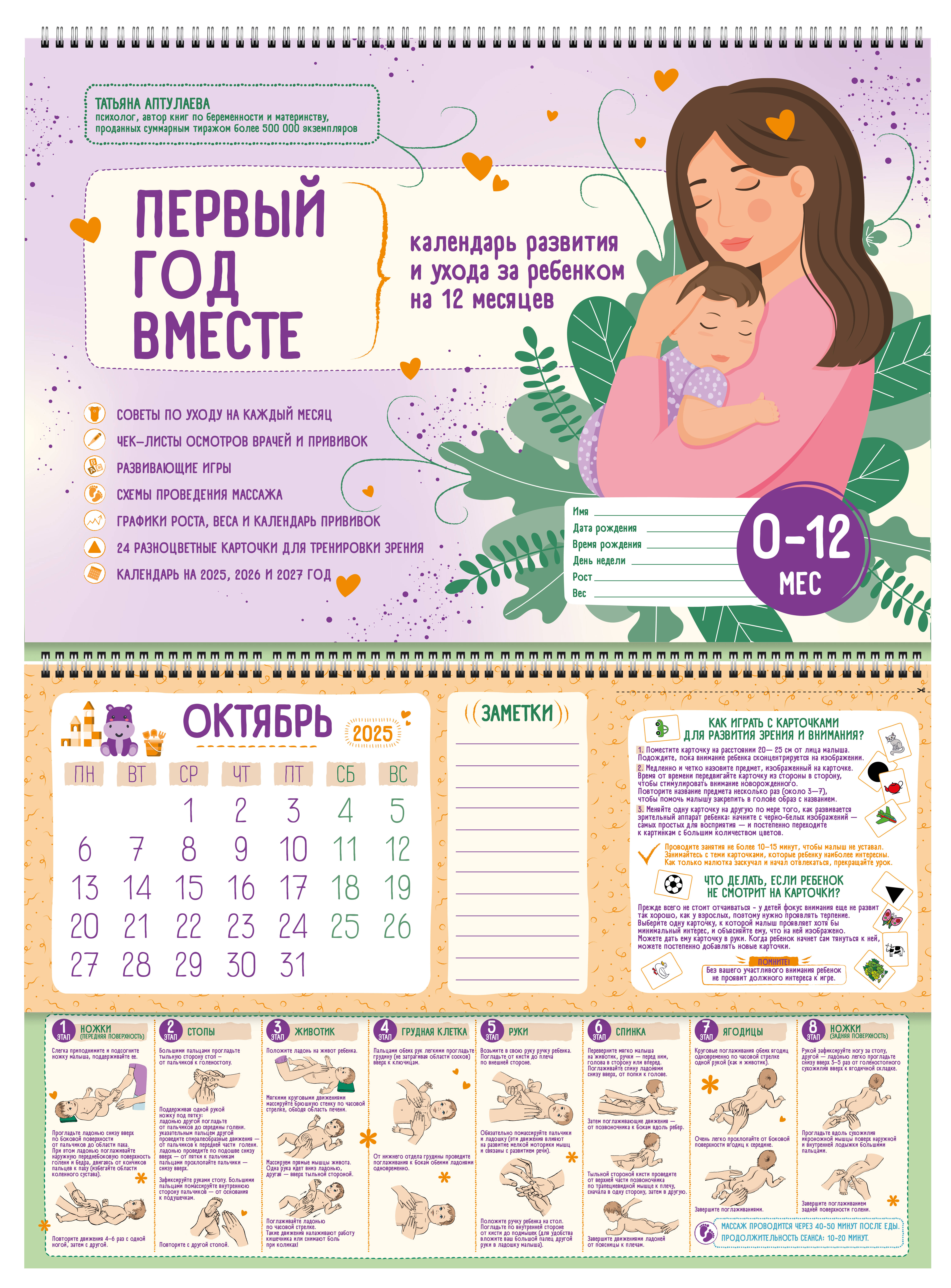 Этот календарь — подробное руководство на первые 12 месяцев жизни с вашим крохой. В нем собрана самая важная информация о том, как ухаживать за младенцем и развивать его навыки каждый месяц.