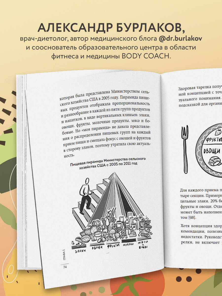 АВТОР КНИГИ, АЛЕКСАНДР БУРЛАКОВ, врач-диетолог, автор медицинского блога @dr.burlakov и cооснователь образовательного центра в области фитнеса и медицины BODY COACH, рассматривает рацион с точки зрения доказательной медицины и современной науки.