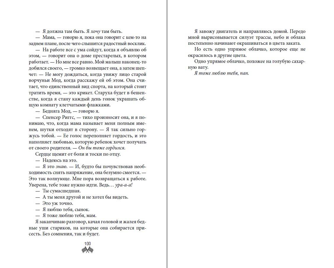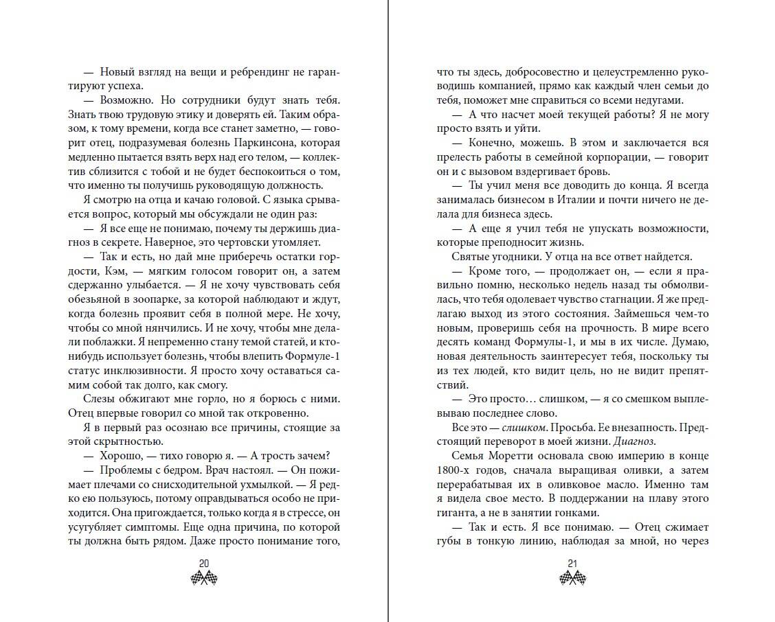 Когда тяжелобольной отец просит меня занять его место управляющего командой «Формулы-1», я соглашаюсь. Возможно, это его последняя просьба, и я сделаю все, чтобы сдержать обещание. Даже если на моем пути встанет горячий гонщик. Звезда «Формулы-1» Спенсер Риггс напорист в своем стремлении к победе. Этот самоуверенный новенький ведет себя так, словно все здесь уже принадлежит ему, включая дочь босса. Сын знаменитого гонщика прошлого, Риггс во что бы то ни стало хочет выйти из тени отца, иногда прибегая ради этого к по-настоящему рискованным приемам. У меня есть причины не доверять гонщикам, и я предпочитаю не подпускать Риггса близко. Но когда он целует меня, плохие воспоминания из прошлого незаметно отступают, и сдерживать обещание становится все сложнее. Но ради Риггса я готова рискнуть всем. Вопрос только в том, рискнет ли он всем ради меня?