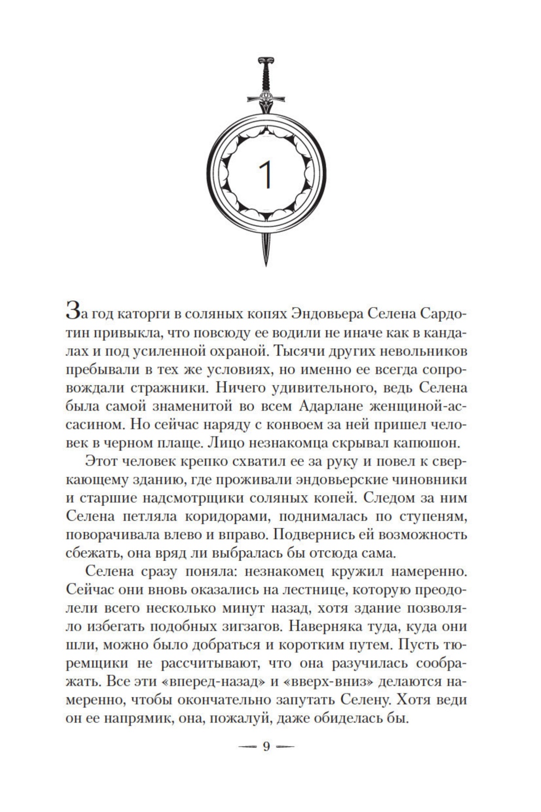 С детских лет ее учили убивать. К восемнадцати она стала самой известной женщиной-ассасином во всем королевстве. И даже из мрачных каторжных подземелий, куда она была сослана, ее имя продолжает вызывать страх и трепет. Селена Сардотин. Хладнокровная преступница и очаровательная пленница, чьи сила и способности могут понадобиться ее врагам. Но сначала она должна доказать свое превосходство на турнире в стеклянном замке. Это единственный путь к свободе в стране, где по приказу короля уничтожены древние знания и жестоко карается даже простое упоминание о магии. Но магию не вытравить по принуждению, она способна проявляться неожиданно. Как и любовь.