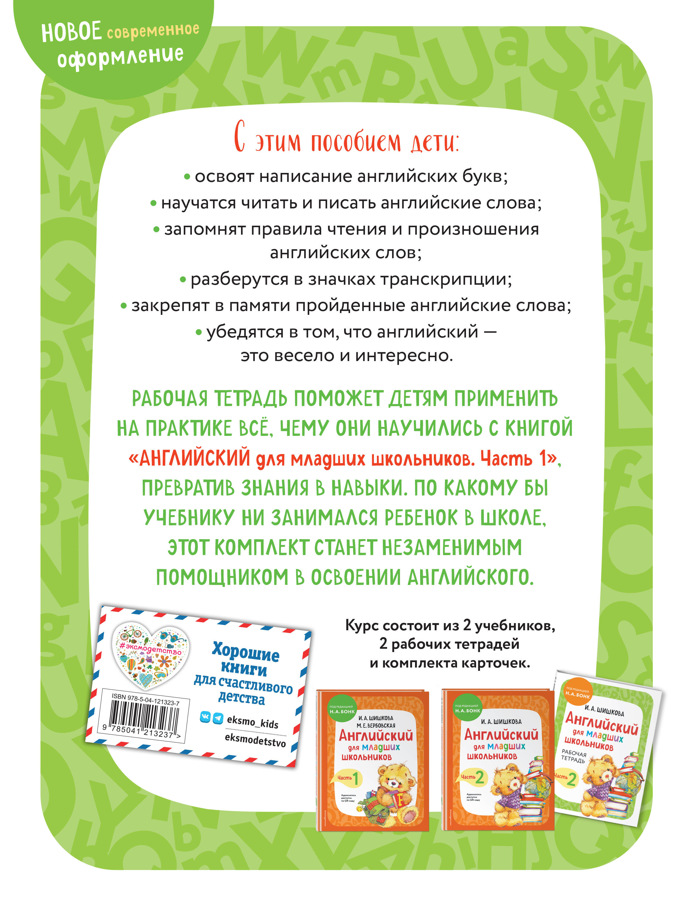 Первая часть рабочей тетради «Английский язык для младших школьников» — это возможность потренироваться в написании и использовании слов и букв, усвоить их произношение и научиться понимать значки транскрипции. По какому бы учебнику ни занимался ваш школьник, базовые знания по английскому языку помогут ему успешнее справляться с заданиями и лучше понимать материал на уроках. А главное — он приобретет реальные знания, которые непременно помогут получать отличные оценки и чувствовать себя уверенно и на уроках, и в путешествиях!