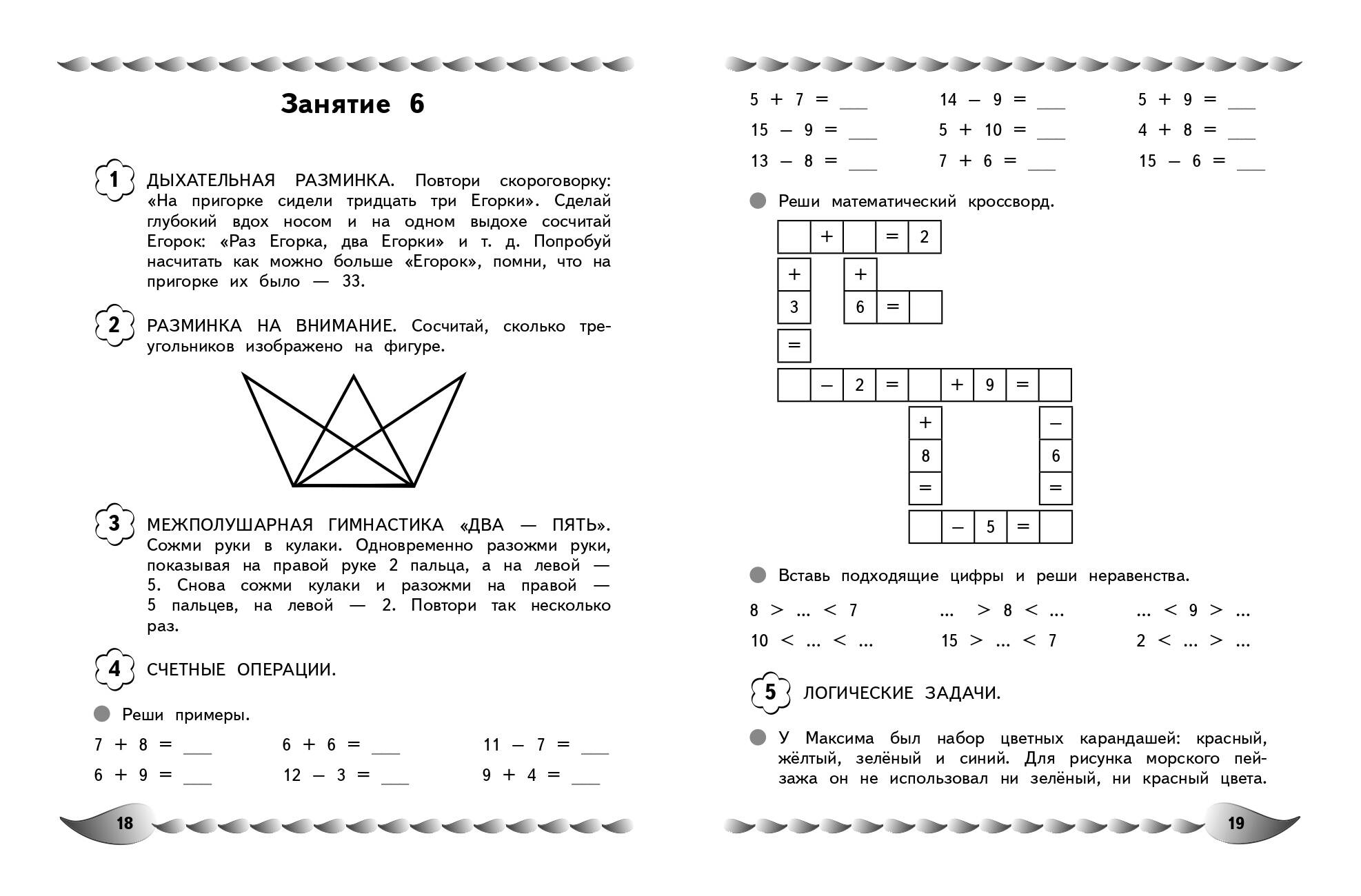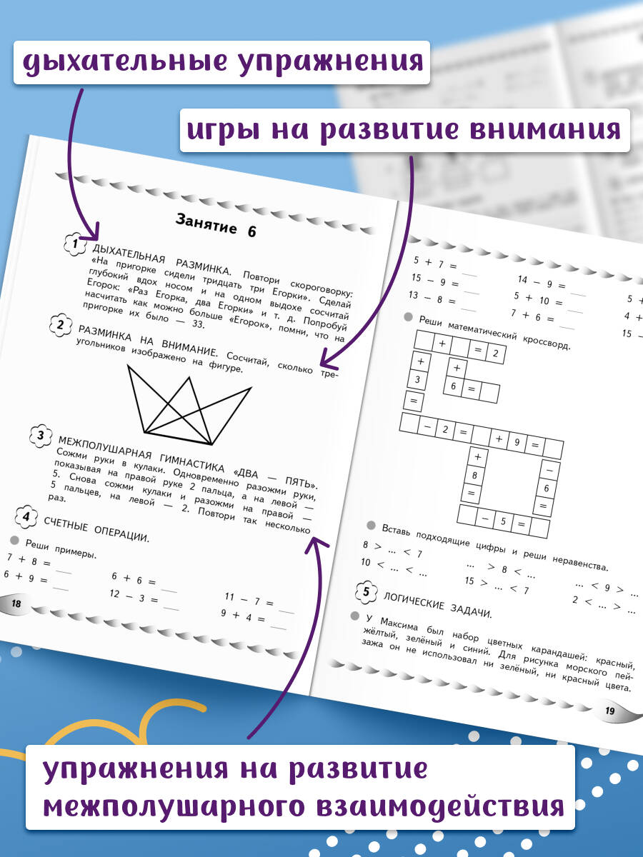 Пособие по активизации математических способностей подготовлено практикующим нейропсихологом, преподавателем НИЦ Детской нейропсихологии имени А. Р. Лурия, который каждый день помогает учащимся начальной школы справиться с возникающими проблемами в обучении. Цель книги — формирование и закрепление у детей навыков счёта, приёмов сложения и вычитания в пределах 100, приобретения опыта решения логических задач. В каждом занятии, кроме примеров на сложение и вычитание, неравенств и равенств, заданий на состав числа и составление последовательностей, решения логических задач, даются ещё и дыхательные упражнения, игры на развитие внимания и межполушарного взаимодействия, что позволит быстро и качественно обрабатывать поступающую информацию. Вопросы и задания в разделах выстроены в определенном порядке, который помогает активизировать механизмы соответствующих отделов мозга. Использование пособия по активизации математических способностей в учебном процессе или в качестве дополнительного материала позволит ребенку своевременно устранить всевозможные сложности в усвоении школьной программы и формировании необходимых навыков. Кроме того, в серию "Уроки нейропсихолога в начальной школе" входят книги: "Развитие разных видов памяти и внимания: для детей 8-10 лет", "Исправление почерка и профилактика дисграфии: для детей 8-10 лет", "Развитие навыка грамотного письма: для детей 9-10 лет", "Пишу без ошибок. Развитие орфографической зоркости: для детей 9-10 лет", Развитие математических способностей и навыков: для детей 9-10 лет", "Говорю грамотно. Развитие речевого потенциала: для детей 8-10 лет".