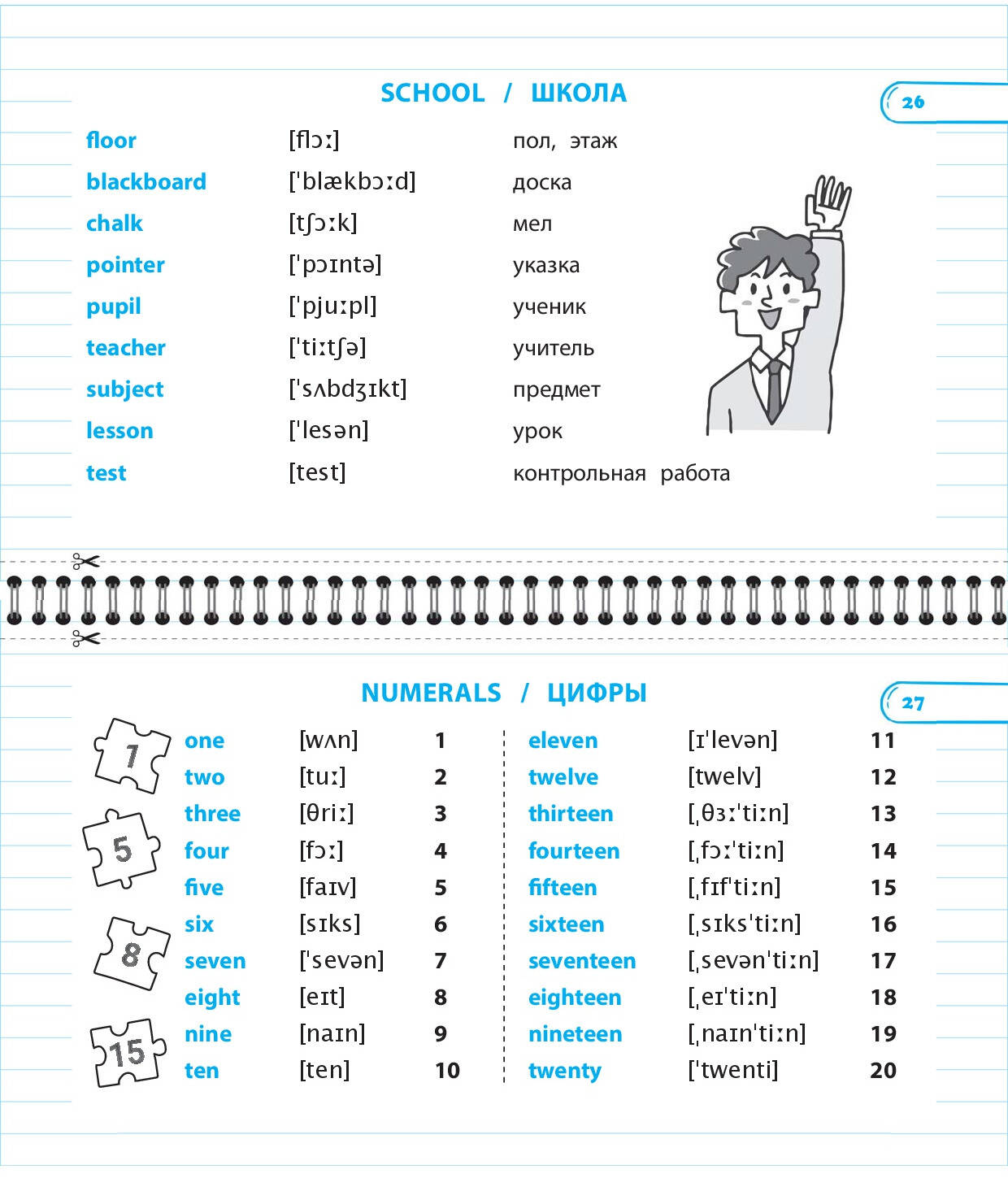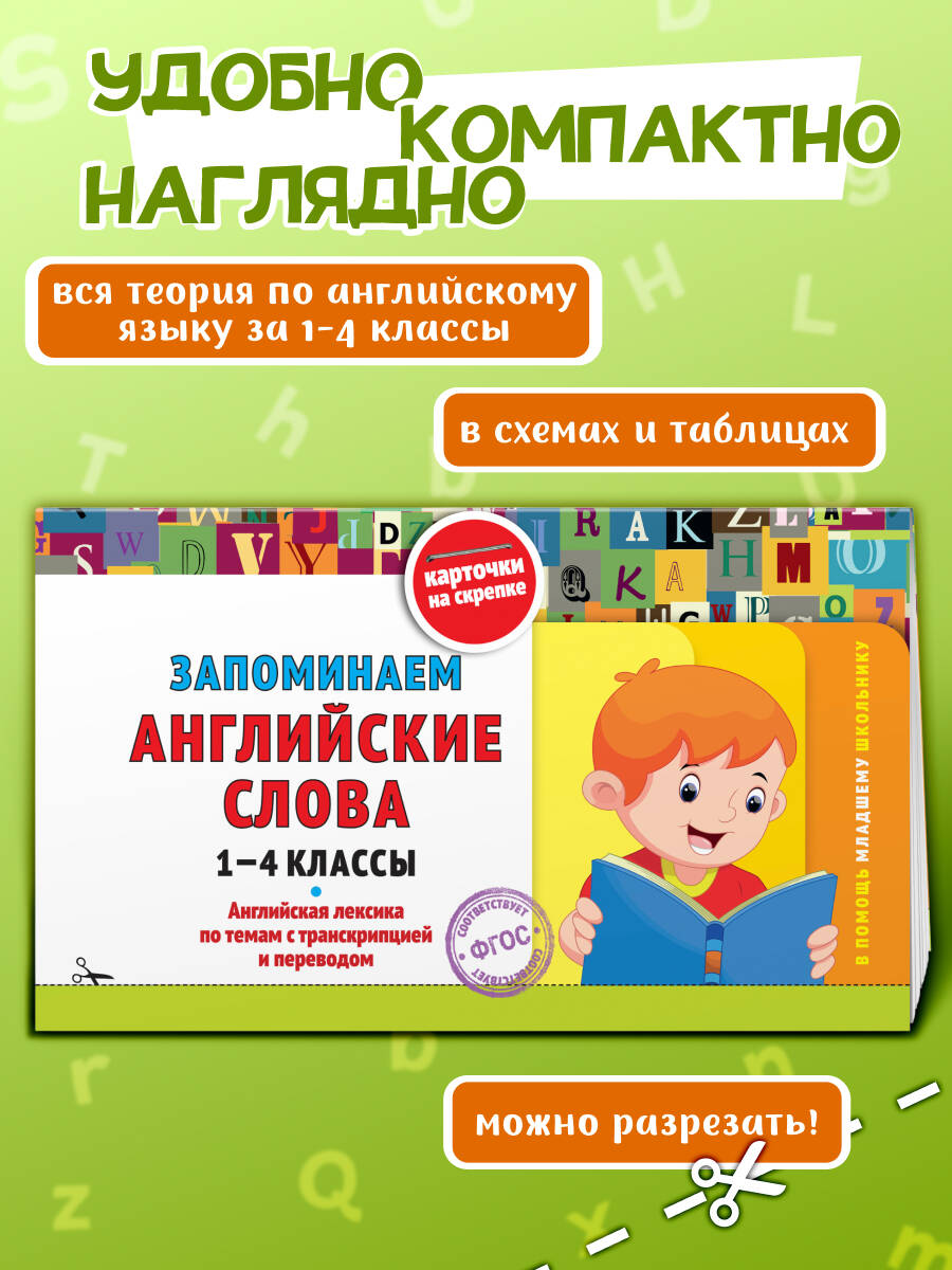 Карточки на скрепке способствуют закреплению знаний, полученных в школе. В пособие включены слова, которые обязательно должны входить в активный словарь младшего школьника, изучающего английский язык. Примеры и иллюстрации помогут ученику быстрее и надежнее запоминать слова.