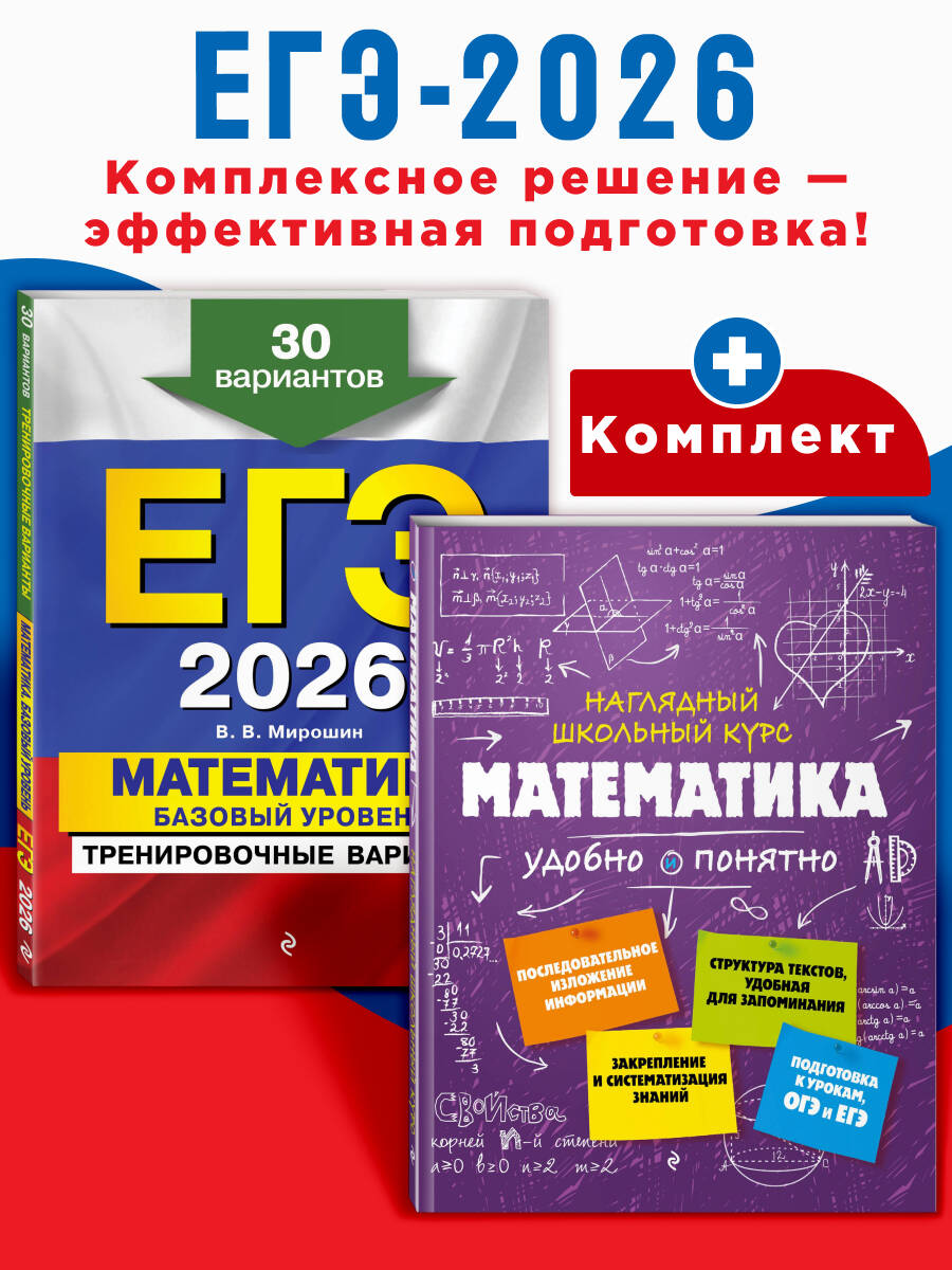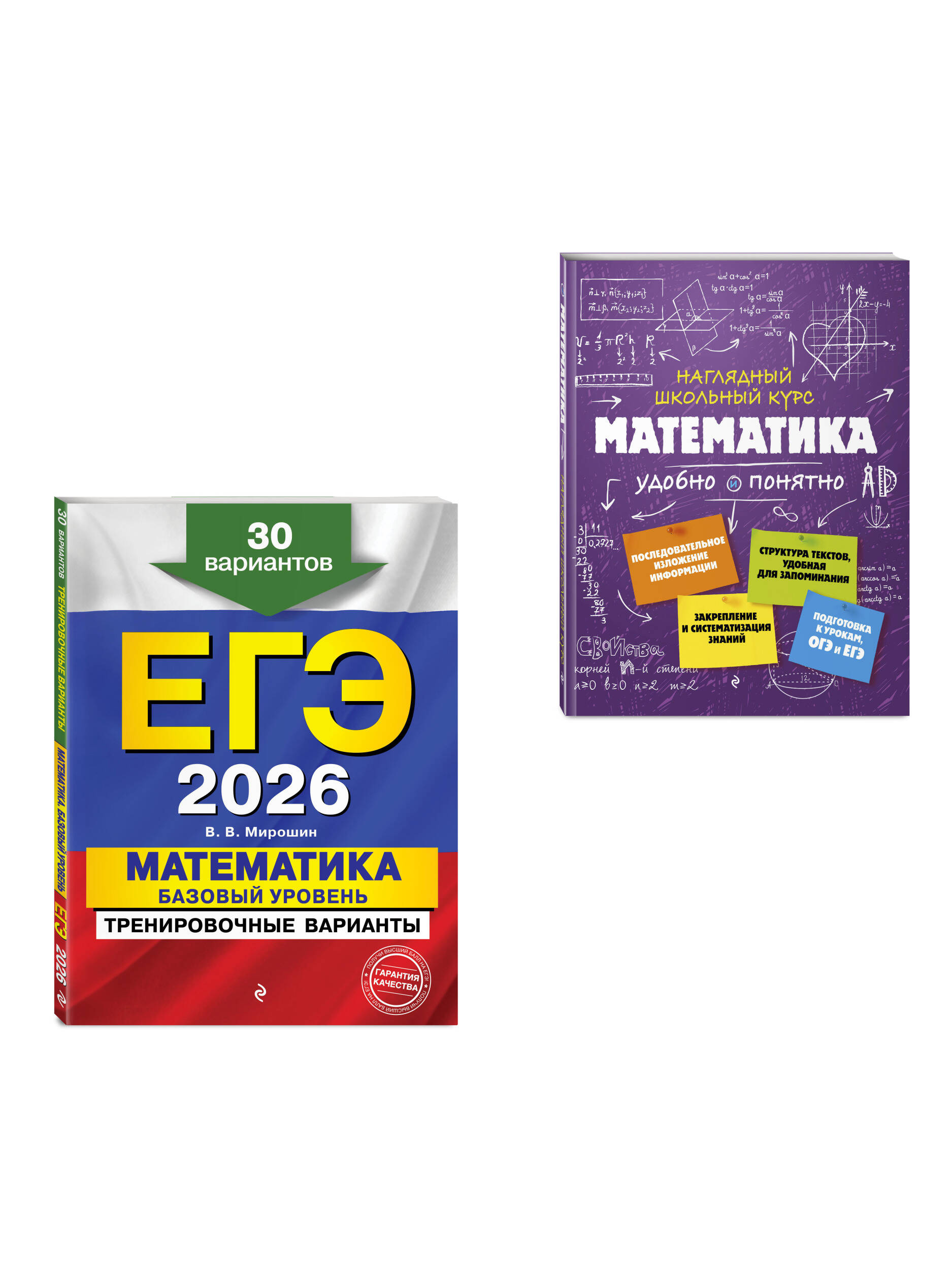В комплект вошли книги: «ЕГЭ-2026. Математика. Базовый уровень. Тренировочные варианты. 30 вариантов» и «Математика» из серии «Наглядный школьный курс: удобно и понятно», адресованные выпускникам старшей школы для подготовки к ЕГЭ по базовой математике.