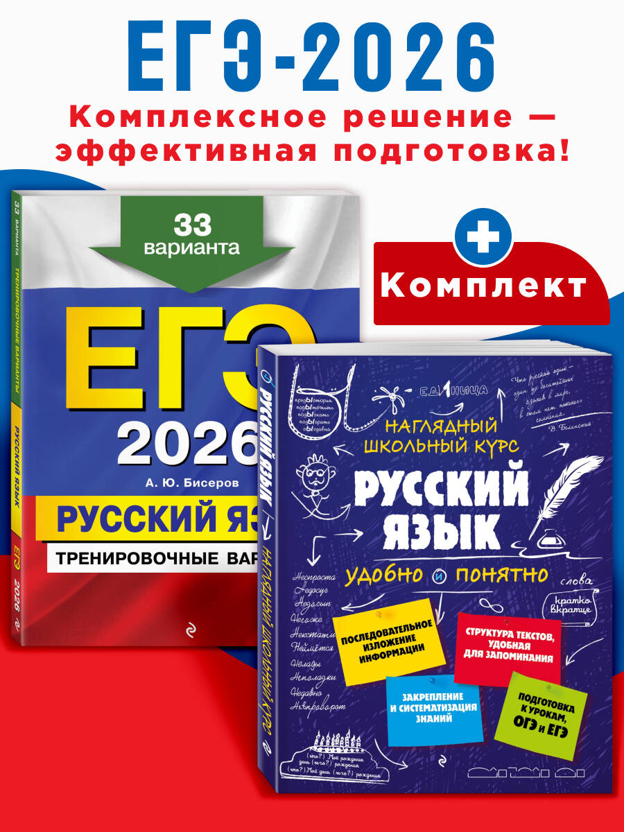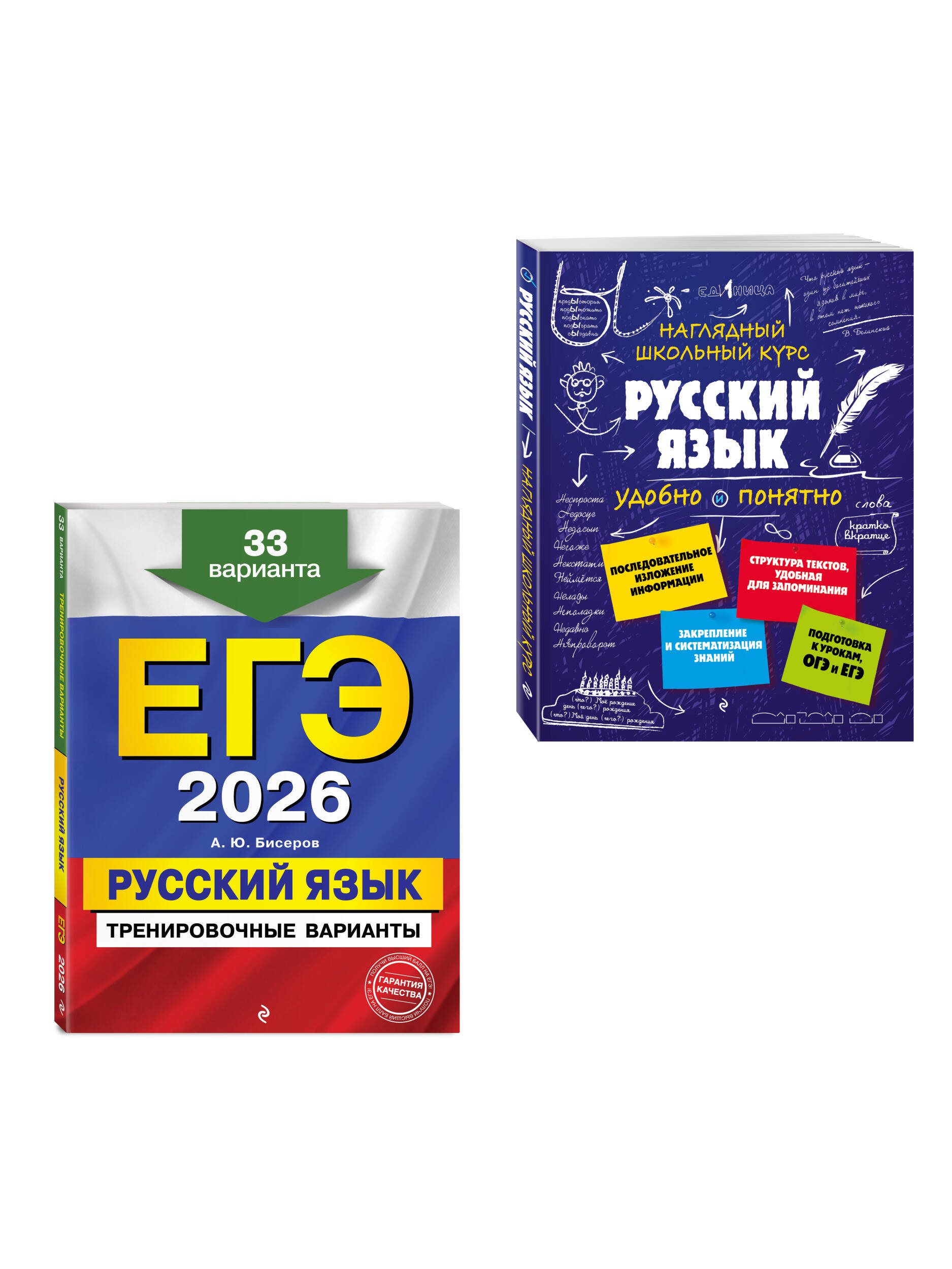 В комплект вошли книги: «ЕГЭ-2026. Русский язык. Тренировочные варианты. 33 варианта» и «Русский язык» из серии «Наглядный школьный курс: удобно и понятно», адресованные выпускникам старшей школы для подготовки к ЕГЭ по обществознанию.