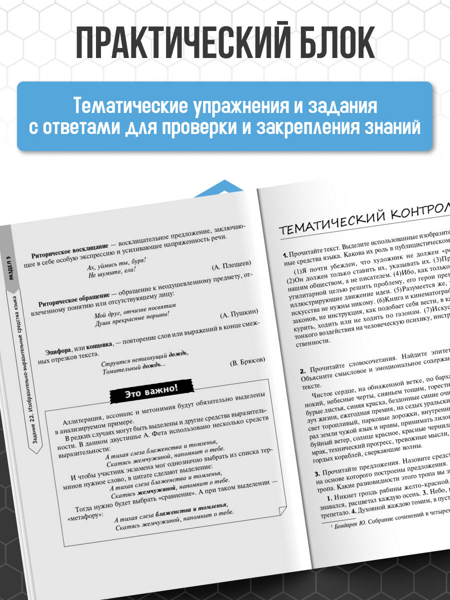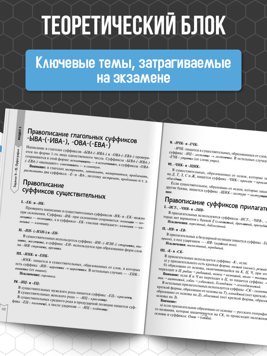 Данный справочник — идеальный вариант для тех, кто стремится сдать экзамен на «отлично», потому что он сочетает в себе глубокую теоретическую базу, как в учебнике, с обширной практической частью. Каждый раздел книги тщательно проработан опытными специалистами и преподавателями, чтобы помочь вам разобраться даже в самых сложных аспектах русского языка!