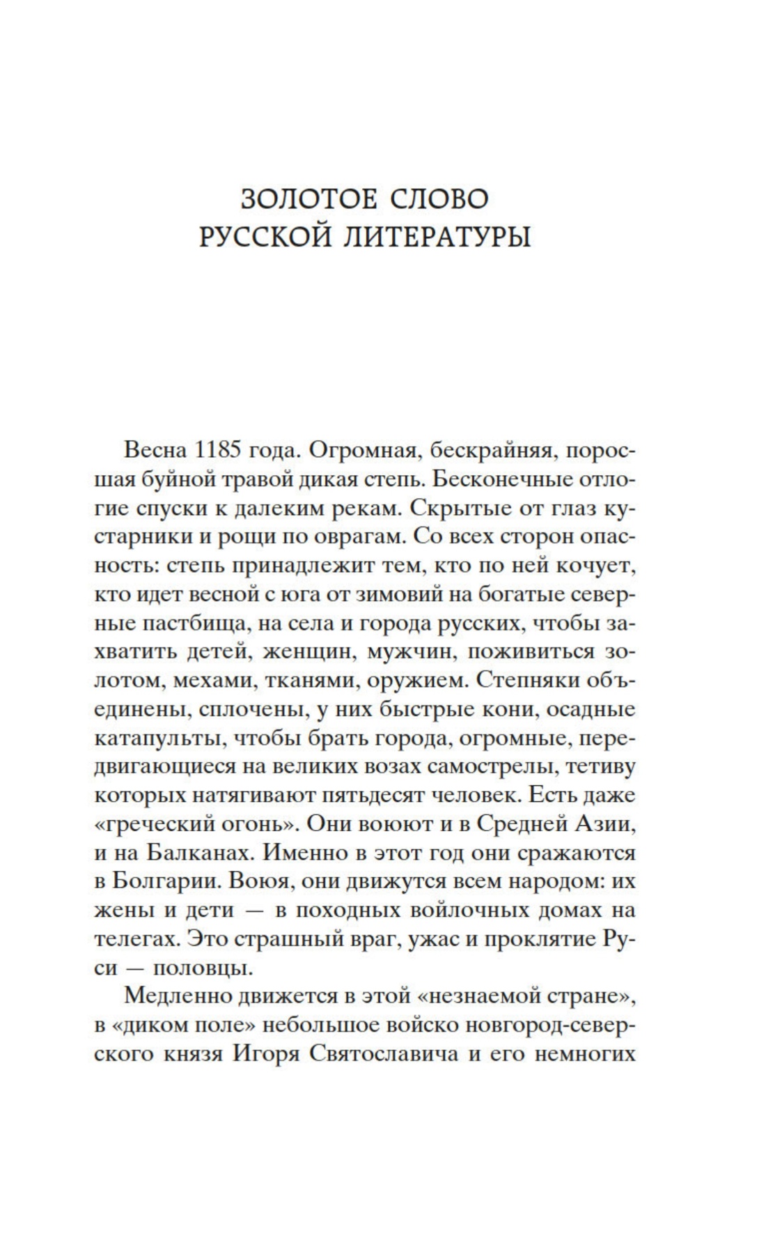 «Слово о полку Игореве» — памятник древнерусской литературы, повествующий о неудачном походе новгород-северского князя Игоря Святославича против половцев в 1185 году. Проникнутое идеей патриотизма, «Слово» является уникальным произведением лирико-эпического жанра, в котором книжные традиции сочетаются с мотивами и образами народной поэзии и славянской мифологии. По своему художественному значению «Слово» выделяется на фоне других памятников древнерусской литературы и относится к числу наиболее значительных достижений европейского средневекового эпоса. Обнаруженное в составе рукописного сборника А. И. Мусиным-Пушкиным и опубликованное в 1800 году, «Слово», по мнению поэта А. Н. Майкова, «сделало эпоху в нашем литературном мире». Оно привлекло внимание не только исследователей, но и поэтов, художников, музыкантов. «Слово» стало объектом многочисленных стихотворных переводов и переложений, лучшие из которых включены в настоящее издание.