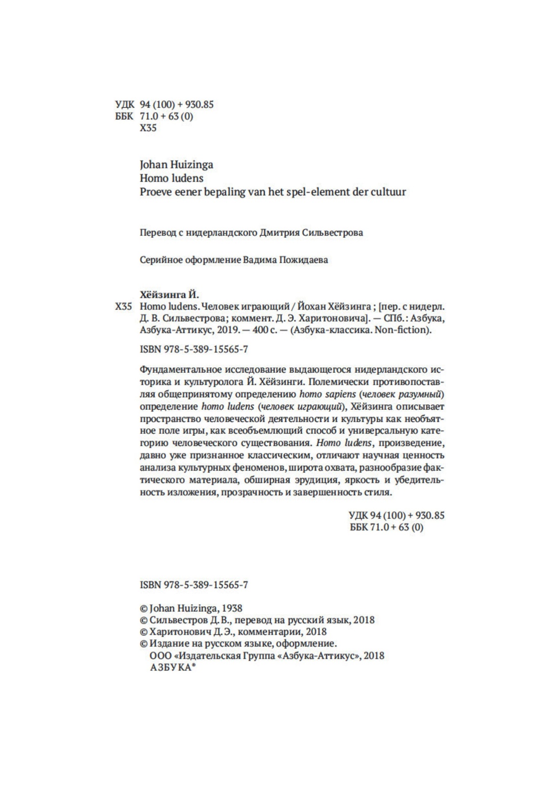 Фундаментальное исследование выдающегося нидерландского историка и культуролога Й. Хёйзинги. Полемически противопоставляя общепринятому определению homo sapiens (человек разумный) определение homo ludens (человек играющий), Хёйзинга описывает пространство человеческой деятельности и культуры как необъятное поле игры, как всеобъемлющий способ и универсальную категорию человеческого существования. Homo ludens, произведение, давно уже признанное классическим, отличают научная ценность анализа культурных феноменов, широта охвата, разнообразие фактического материала, обширная эрудиция, яркость и убедительность изложения, прозрачность и завершенность стиля.
