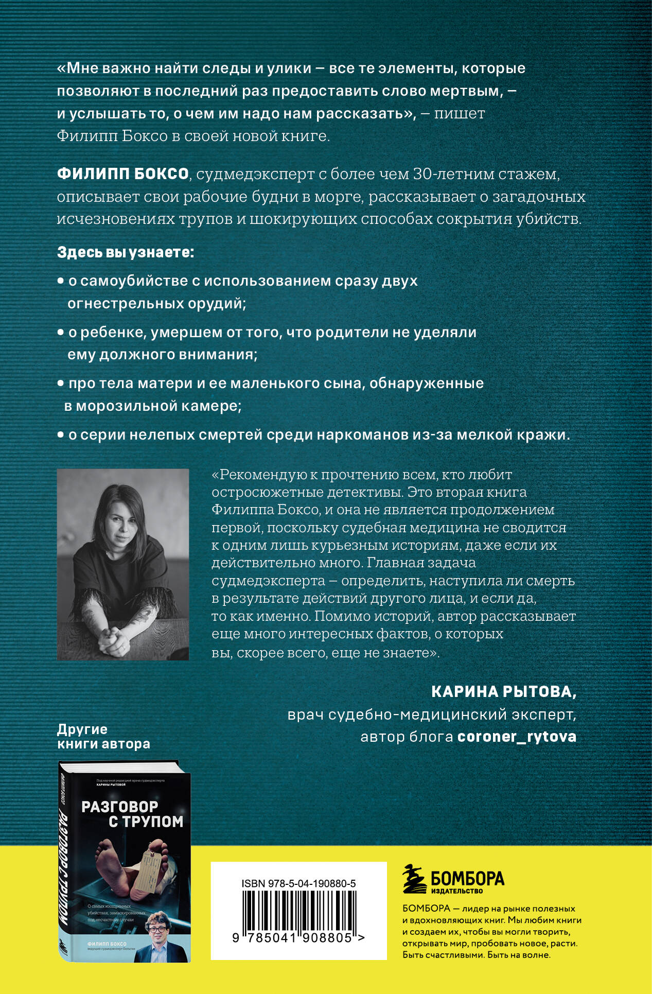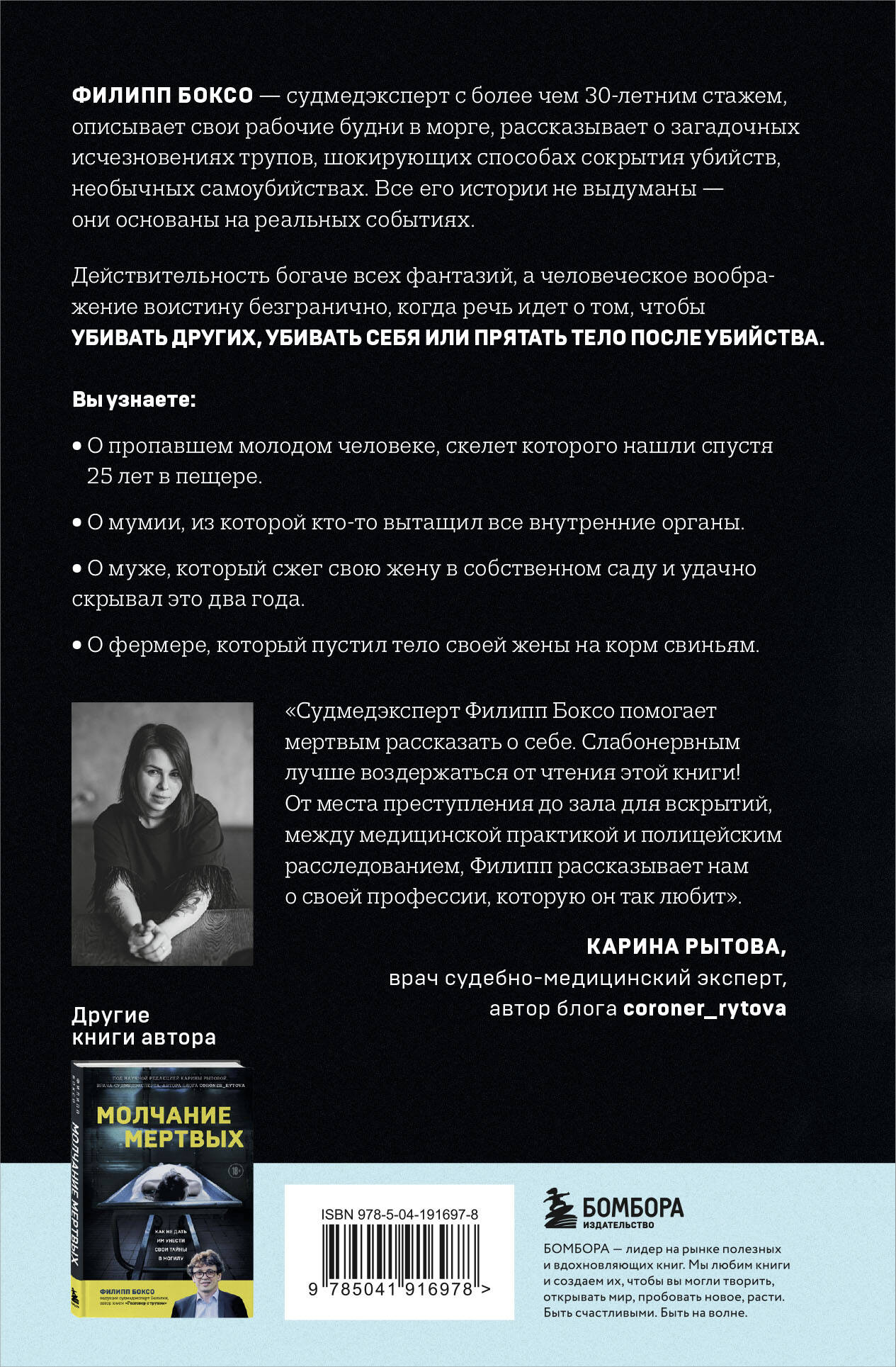 ФИЛИПП БОКСО, судмедэксперт с более чем 30-летним стажем, описывает свои рабочие будни в морге, рассказывает о загадочных исчезновениях трупов, шокирующих способах сокрытия убийств, необычных самоубийствах. Все его истории не выдуманы — они основаны на реальных событиях.
