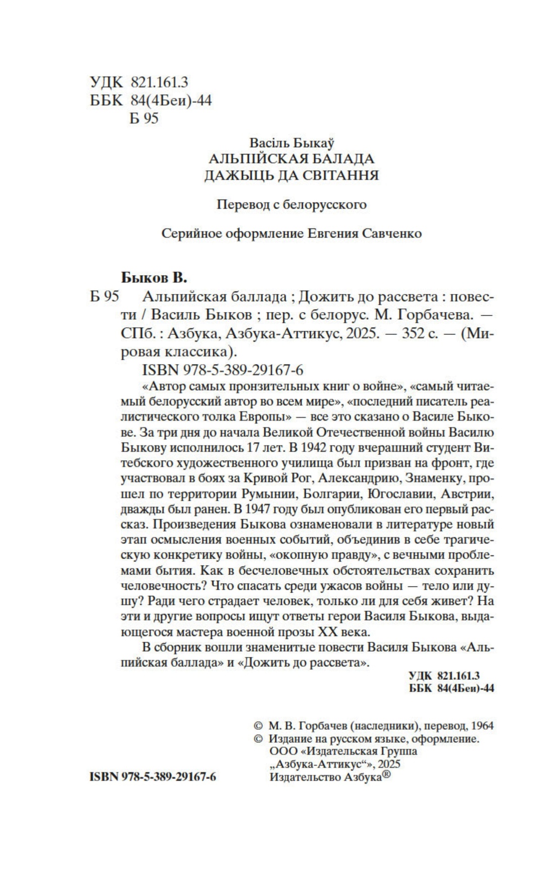 В сборник вошли знаменитые повести Василя Быкова «Альпийская баллада» и «Дожить до рассвета».