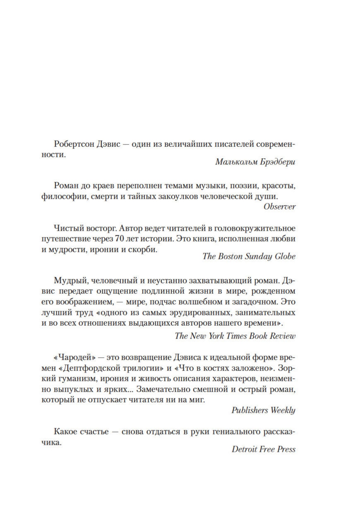 «Чародей» — последний роман канадского мастера и его творческое завещание — это «возвращение Дэвиса к идеальной форме времен “Дептфордской трилогии” и “Что в костях заложено”» (Publishers Weekly), это роман, который «до краев переполнен темами музыки, поэзии, красоты, философии, смерти и тайных закоулков человеческой души» (Observer). Здесь появляются персонажи не только из предыдущего романа Дэвиса «Убивство и неупокоенные духи», но даже наш старый знакомец Данстан Рамзи из «Дептфордской трилогии». Здесь доктор медицины Джонатан Халла — прозванный Чародеем, поскольку умеет, по выражению «английского Монтеня» Роберта Бертона, «врачевать почти любые хвори тела и души», — расследует таинственную смерть отца Хоббса, скончавшегося в храме Святого Айдана прямо у алтаря. И это расследование заставляет Чародея вспомнить всю свою длинную жизнь, богатую на невероятные события и удивительные встречи…