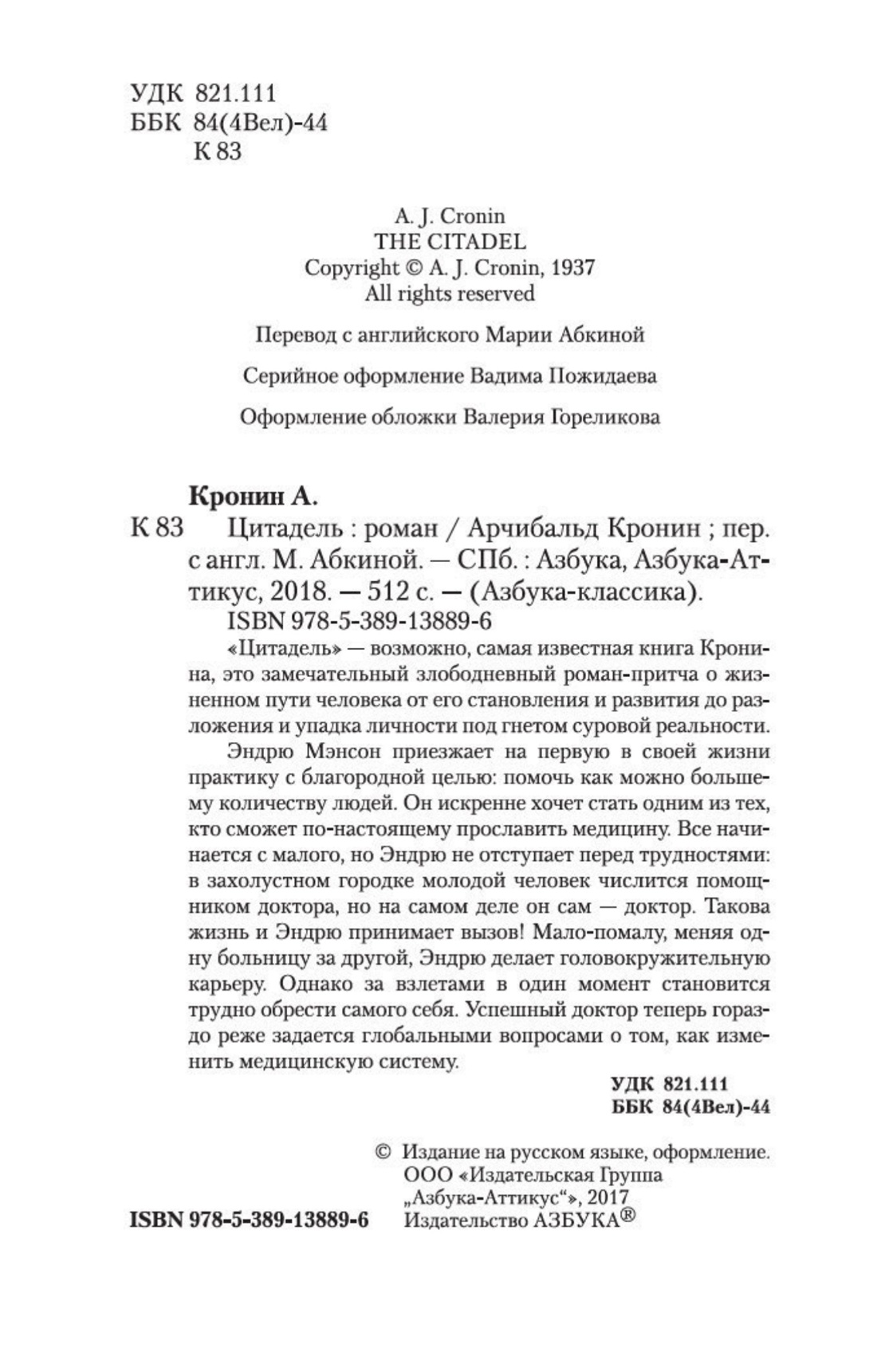 «Цитадель» — возможно, самая известная книга Кронина, это замечательный злободневный роман-притча о жизненном пути человека от его становления и развития до разложения и упадка личности под гнетом суровой реальности.