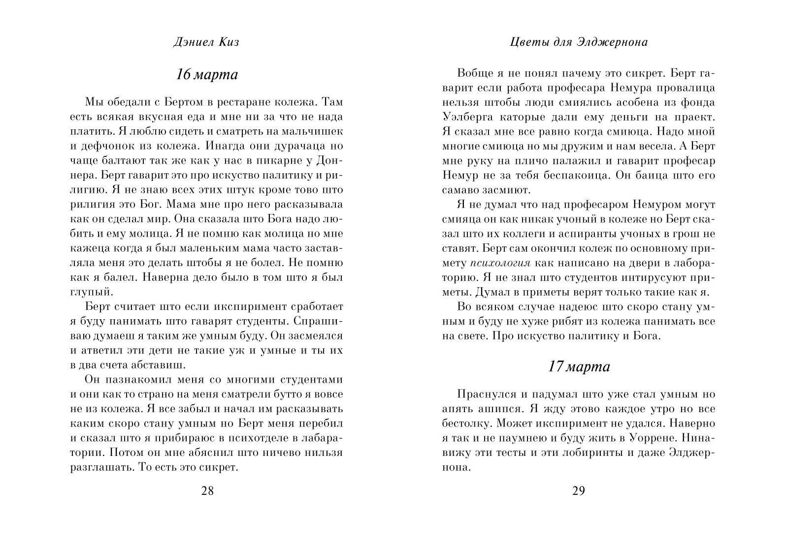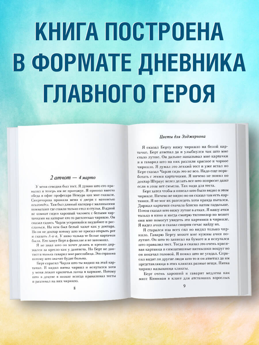 Книга написана в форме дневника самого Чарли, благодаря чему можно увидеть изменение не только его образа мысли, но и уровня интеллекта.