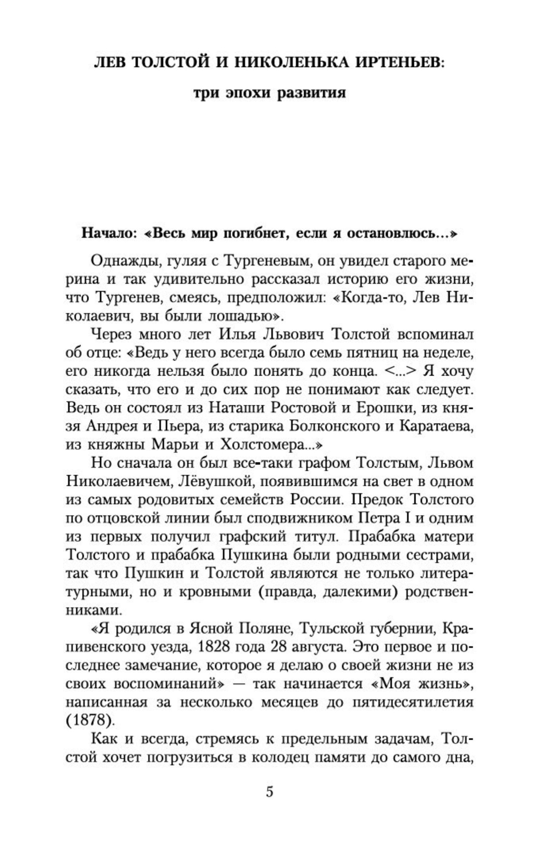 «Десять тысяч верст вокруг самого себя», — пошутил Глеб Успенский по поводу толстовских исканий. В 1852 г. в журнале «Современник» выходит повесть Толстого «Детство», которая вместе с повестями «Отрочество» (1852—1854) и «Юность» (1855—1857) впоследствии составила трилогию. Литературный дебют сразу приносит автору настоящее признание. Правда, в журнале повесть опубликована под заглавием «История моего детства», чем Толстой был возмущен: «Кому какое дело до истории моего детства?..» Опираясь на семейные воспоминания, называя многих прототипов своих персонажей, Толстой пишет все-таки не автобиографию и не мемуары. Его интересуют универсалии человеческой жизни, но всеобщее можно было найти лишь заглянув в себя. «„Детство“, „Отрочество“, „Юность“ — произведения скорее автопсихологические, нежели автобиографические» (Л. Я. Гинзбург). «Автопсихологическая трилогия» стала не только копилкой будущих литературных замыслов, но и раз и навсегда открытым континентом на карте толстовского мира.
