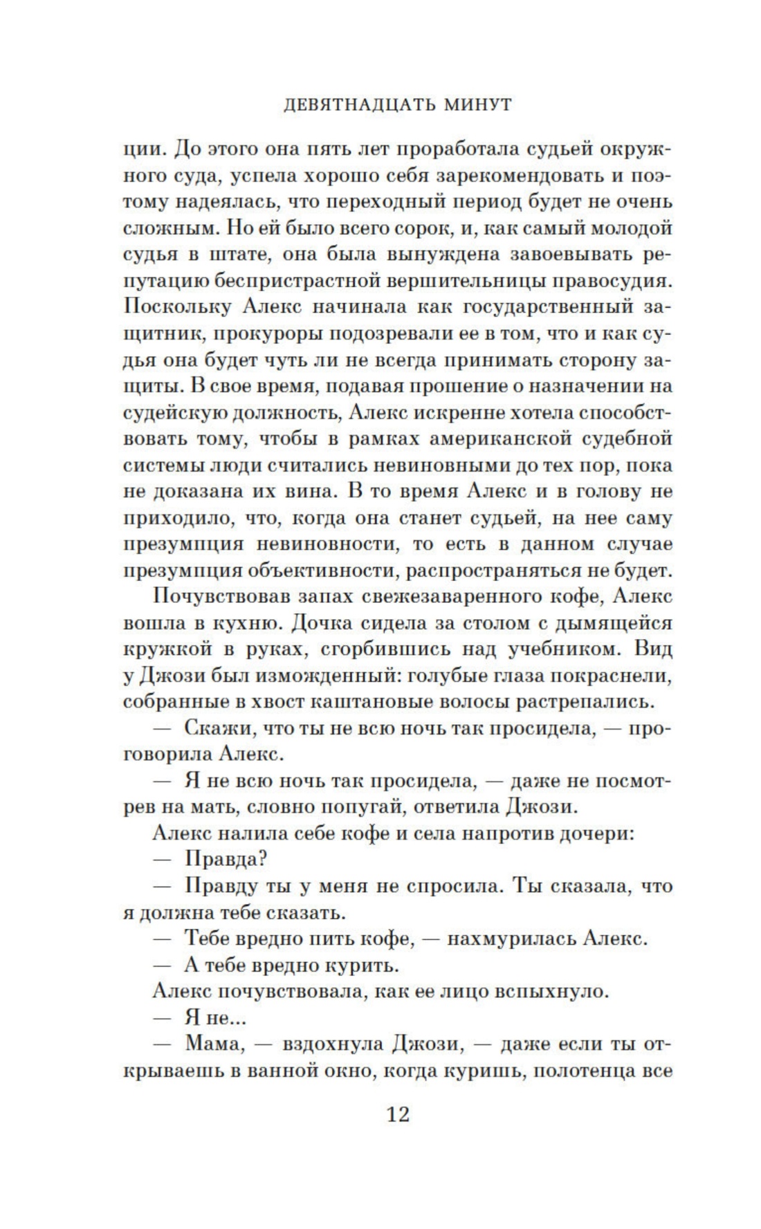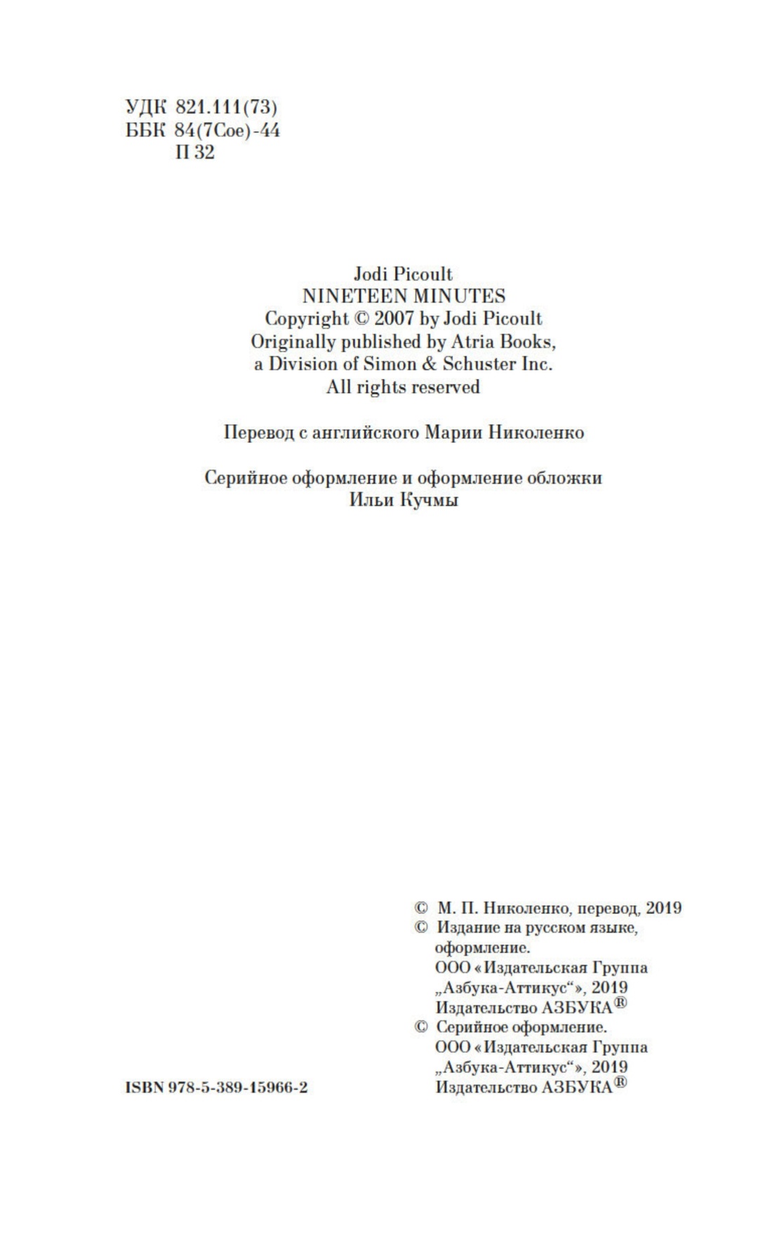 Роман «Девятнадцать минут» ставит простые вопросы, на которые нет простых ответов. Можно ли не знать собственного ребенка? Что значит быть не таким, как все? Оправдано ли желание жертвы нанести ответный удар? И кому вершить суд, если кто-нибудь из нас вообще вправе судить другого?