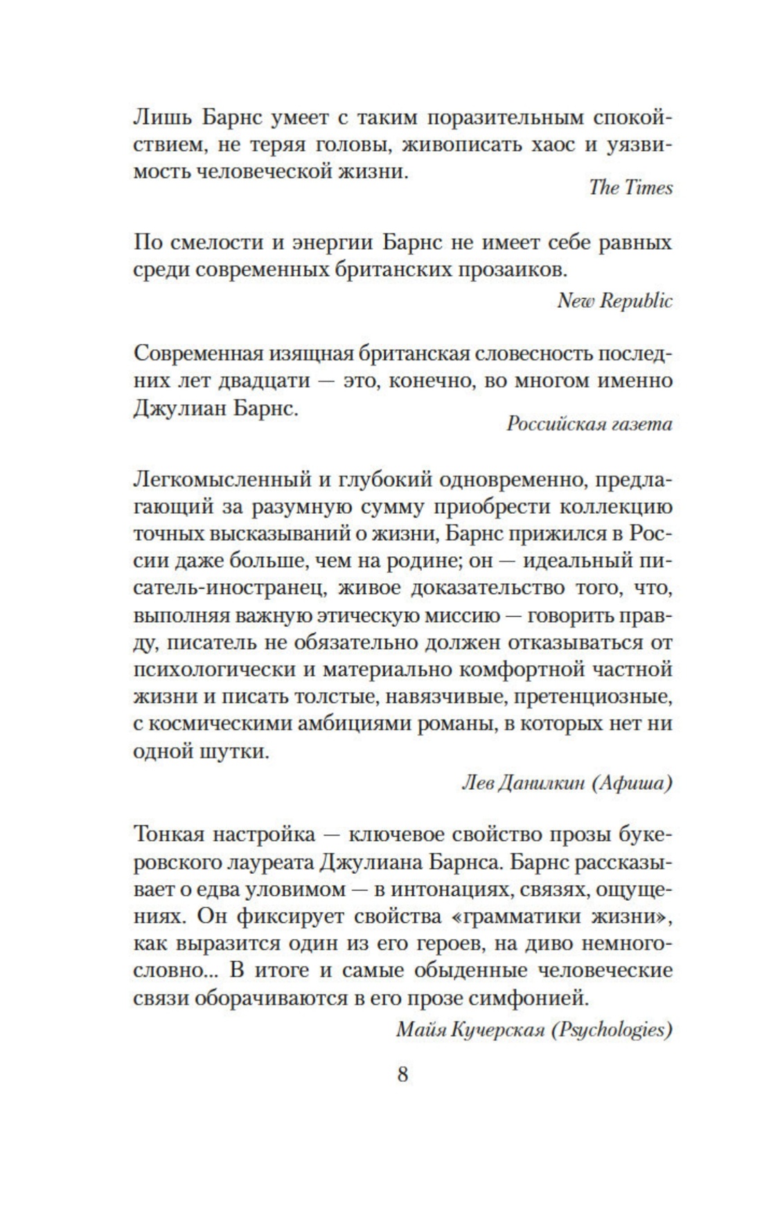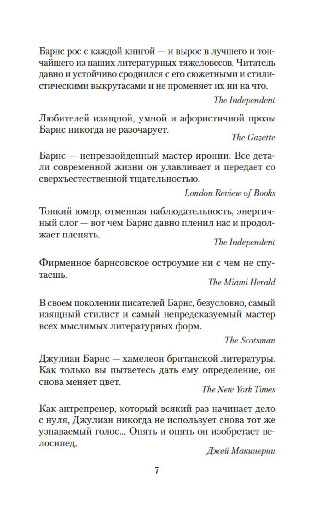 Лауреат Букеровской премии Джулиан Барнс — один из самых ярких и оригинальных прозаиков современной Британии, автор таких международных бестселлеров, как «Одна история», «Шум времени», «Предчувствие конца», «Артур и Джордж», «История мира в 10½ главах», «Попугай Флобера» и многих других. Возможно, основной его талант — умение легко и естественно играть стилями и направлениями. Тонкая стилизация и едкая ирония, утонченный лиризм и доходящий чуть ли не до цинизма сарказм, агрессивная жесткость и веселое озорство — Барнсу подвластно все это и многое другое.