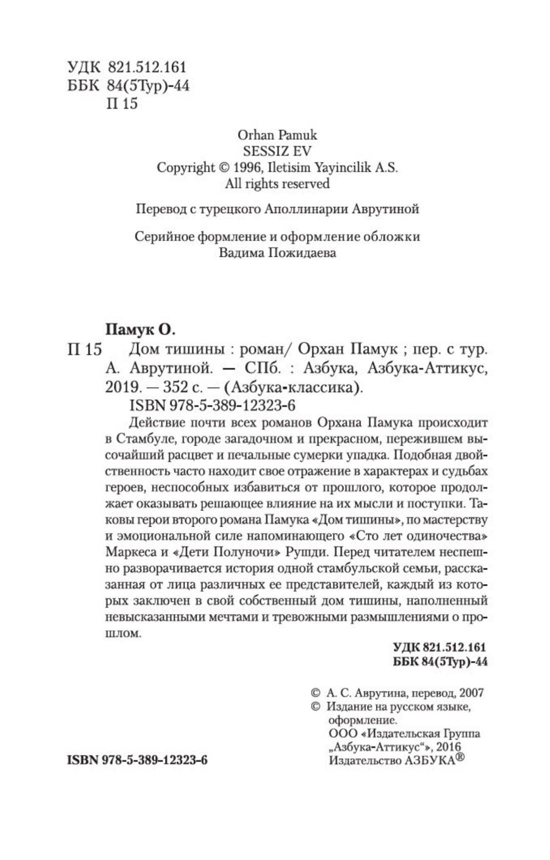 Действие почти всех романов Орхана Памука происходит в Стамбуле, городе загадочном и прекрасном, пережившем высочайший расцвет и печальные сумерки упадка. Подобная двойственность часто находит свое отражение в характерах и судьбах героев, неспособных избавиться от прошлого, которое продолжает оказывать решающее влияние на их мысли и поступки. Таковы герои второго романа Памука «Дом тишины», по мастерству и эмоциональной силе напоминающего «Сто лет одиночества» Маркеса и «Дети Полуночи» Рушди. Перед читателем неспешно разворачивается история одной стамбульской семьи, рассказанная от лица различных ее представителей, каждый из которых заключен в свой собственный дом тишины, наполненный невысказанными мечтами и тревожными размышлениями о прошлом.
