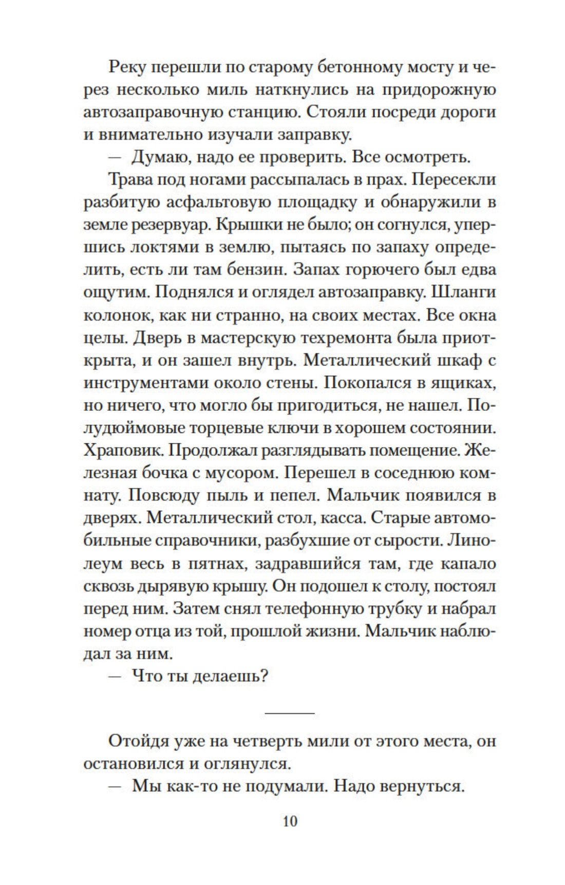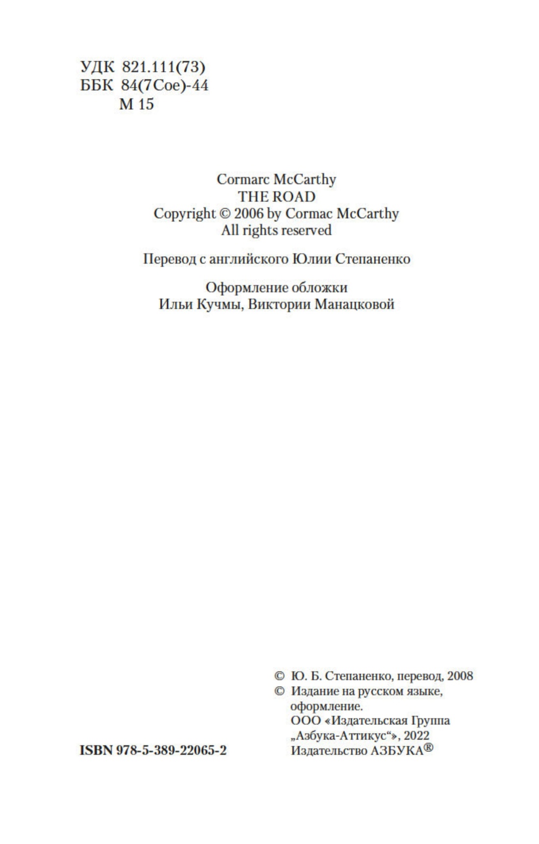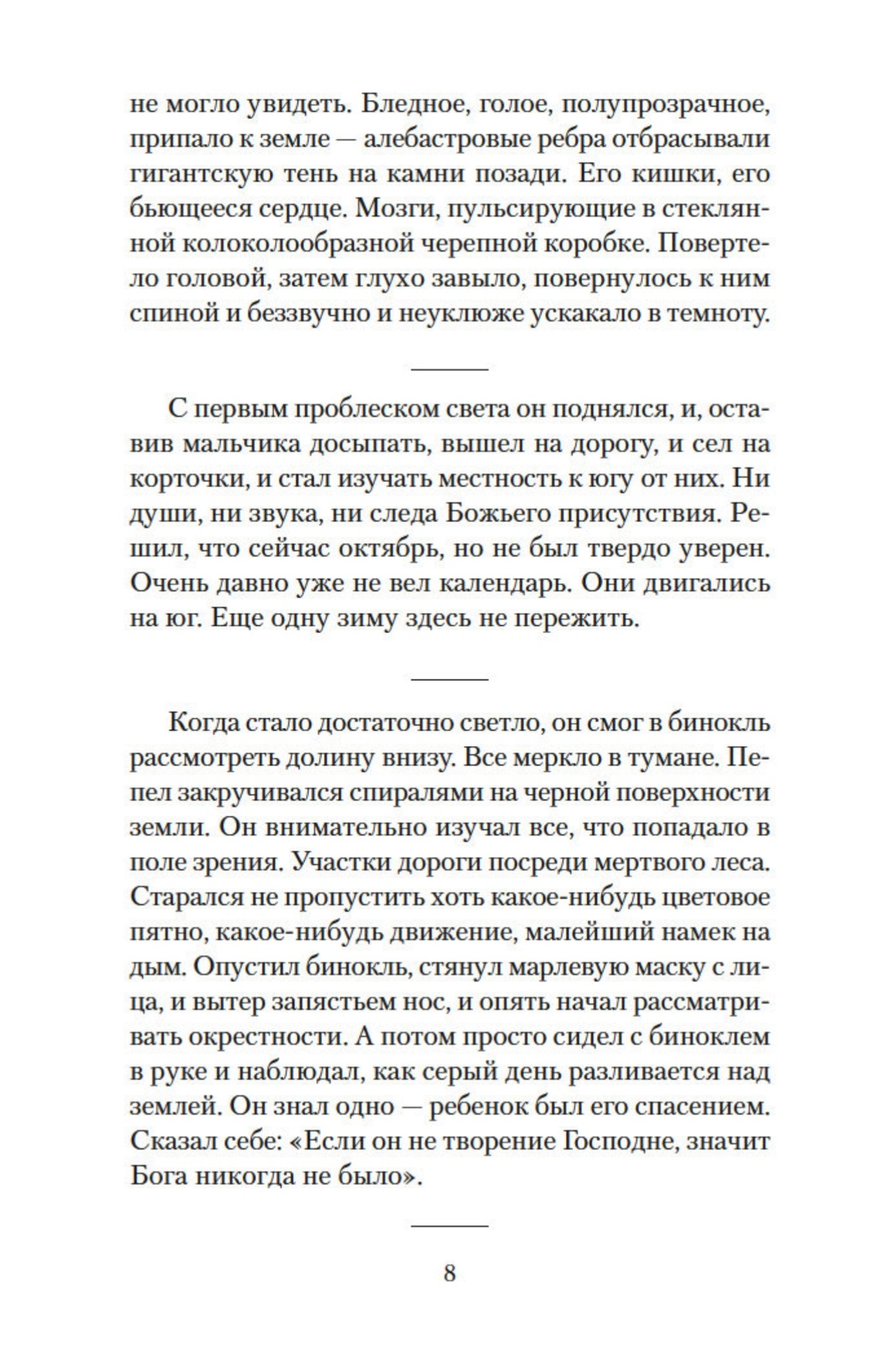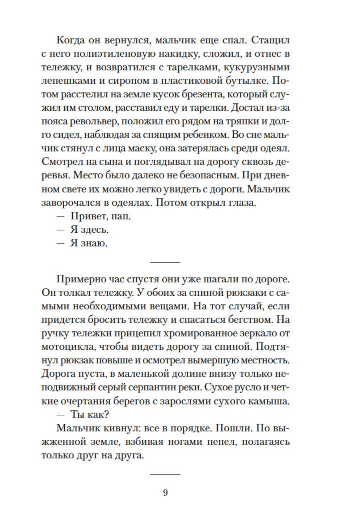 Кормак Маккарти — современный американский классик главного калибра, лауреат Макартуровской стипендии «За гениальность», мастер сложных переживаний и нестандартного синтаксиса, хорошо известный нашему читателю романами «Старикам тут не место», «Кровавый меридиан» и «Пограничной трилогией» («Кони, кони...», «За чертой», «Содом и Гоморра»). Но самый громкий успех ждал поздний роман мэтра: «Дорога» получила Пулицеровскую премию и покорила все мыслимые списки бестселлеров. Не замедлил последовать и фильм, поставленный австралийцем Джоном Хиллкоутом («Предложение», «Самый пьяный округ в мире»); главные роли исполнили Шарлиз Терон и Вигго Мортенсен, музыку к фильму написал Ник Кейв. Итак, после катастрофы Отец и Сын идут через выжженные земли, пересекая континент. Всю книгу пронизывают глубокие, ранящие в самое сердце вопросы. Есть ли смысл жить, если будущего — нет? Вообще нет. Есть ли смысл жить ради детей? Это роман о том, что все в жизни относительно, что такие понятия, как добро и зло, в определенных условиях перестают работать и теряют смысл. Это роман о том, что действительно важно в жизни, и о том, как это ценить. И это также роман о смерти, о том, что все когда-нибудь кончается, и поэтому нужно каждый день принимать таким, какой есть. Нужно просто... жить.