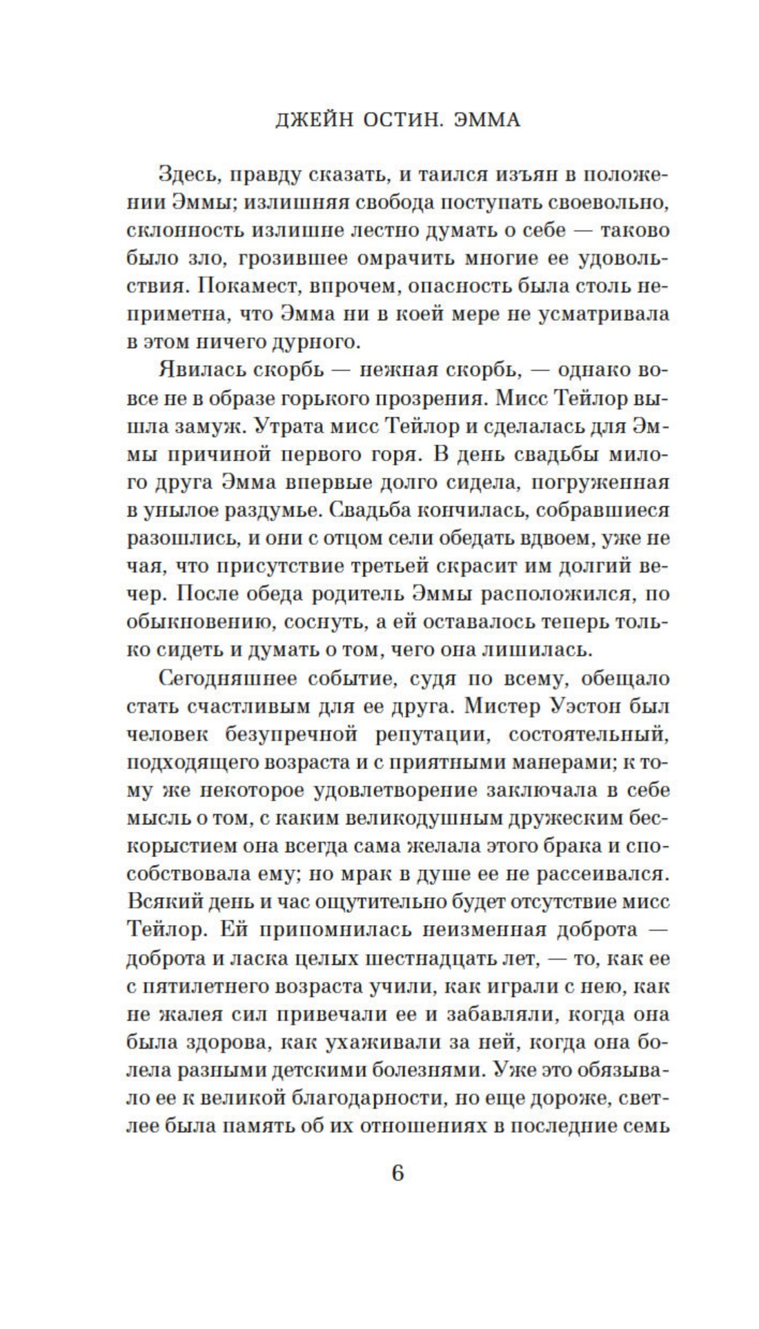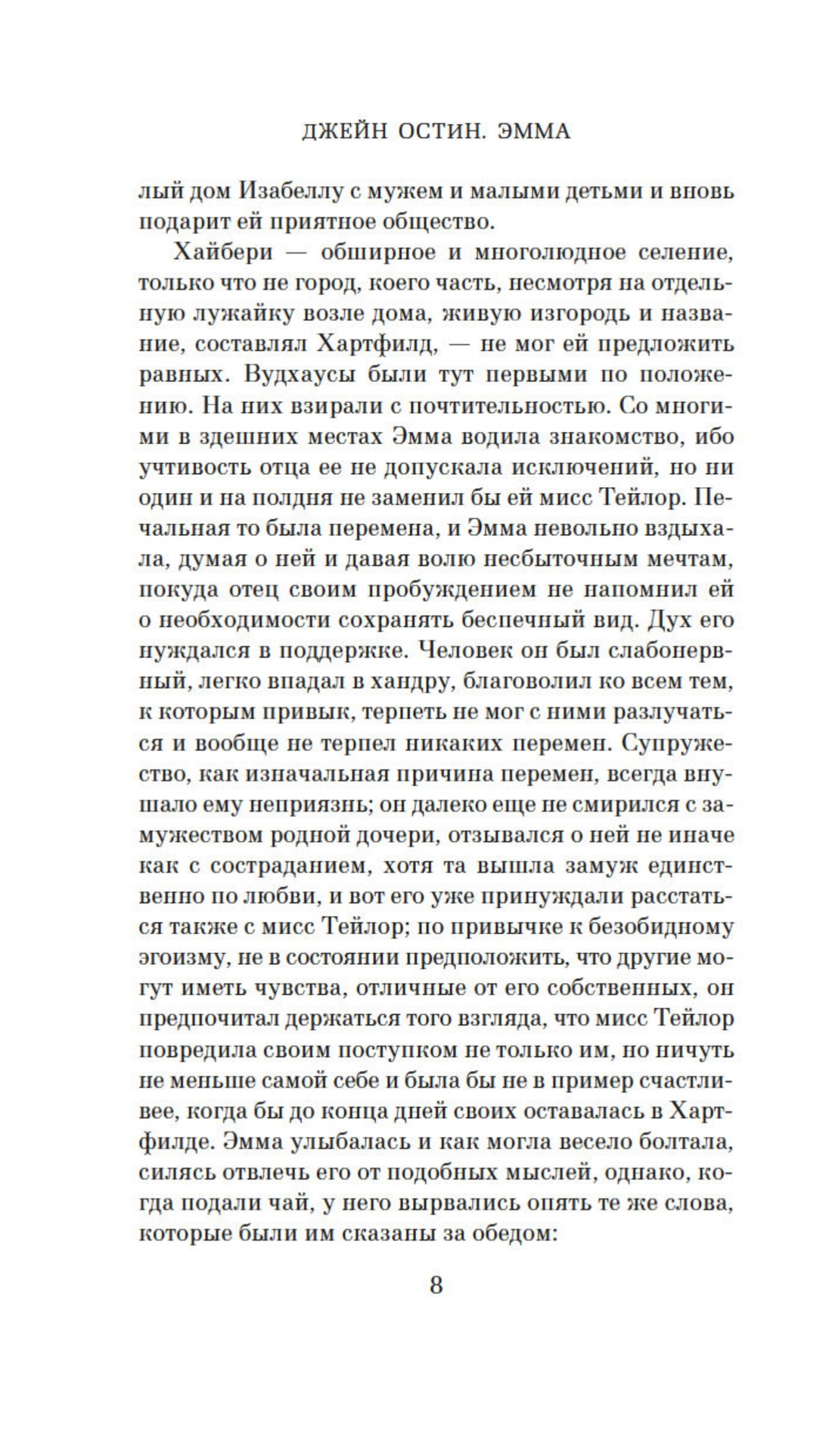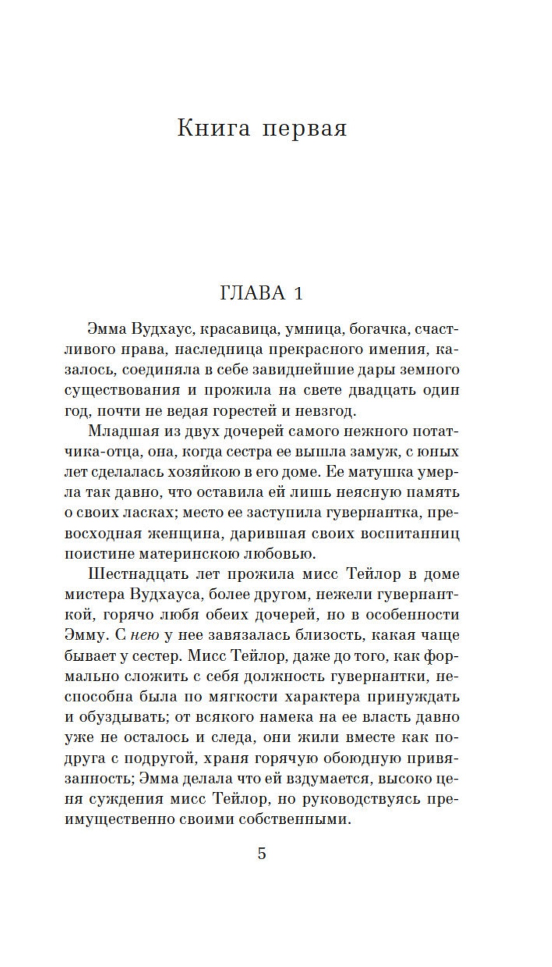 Книги знаменитой на весь мир английской писательницы Джейн Остин уже давно снискали себе славу и читательскую любовь. Тонкость психологического рисунка и ироничная манера повествования придают им особое изящество и глубину. Вальтер Скотт сравнивал произведения Остин с миниатюрами на слоновой кости. «Эмма» — последнее из прижизненно опубликованных произведений Остин. К этому времени уже увидели свет «Гордость и предубеждение», «Чувство и чувствительность» и «Мэнсфилд-парк». Писательница не была уверена в успехе своего романа, однако история Эммы Вудхаус — «красавицы, умницы, богачки, счастливого нрава» — завоевала сердце Вальтера Скотта, который откликнулся на выход книги положительной рецензией, назвав Остин создательницей романа нового типа. Показывая глубокое знание человеческого сердца, писательница запечатлевает тончайшие оттенки чувств героев, а свойственные ее перу остроумие и афористичность нередко вызывают у читателя улыбку. В 2009 году на экраны вышел британский сериал с Ромолой Гарай в роли Эммы и Джонни Ли Миллером, исполнившим роль мистера Найтли, — верный признак того, что произведения Джейн Остин и сегодня захватывают наше воображение.