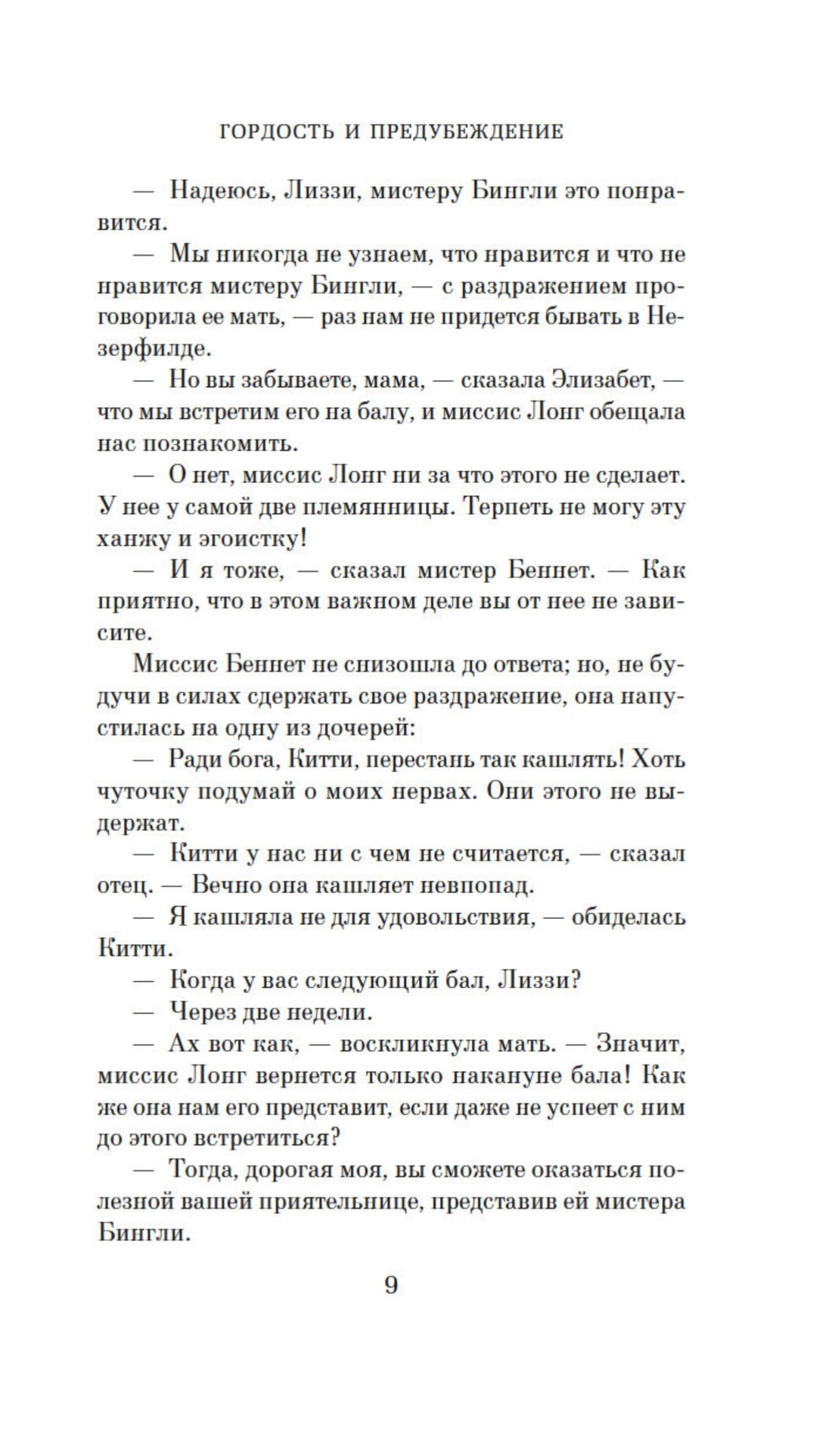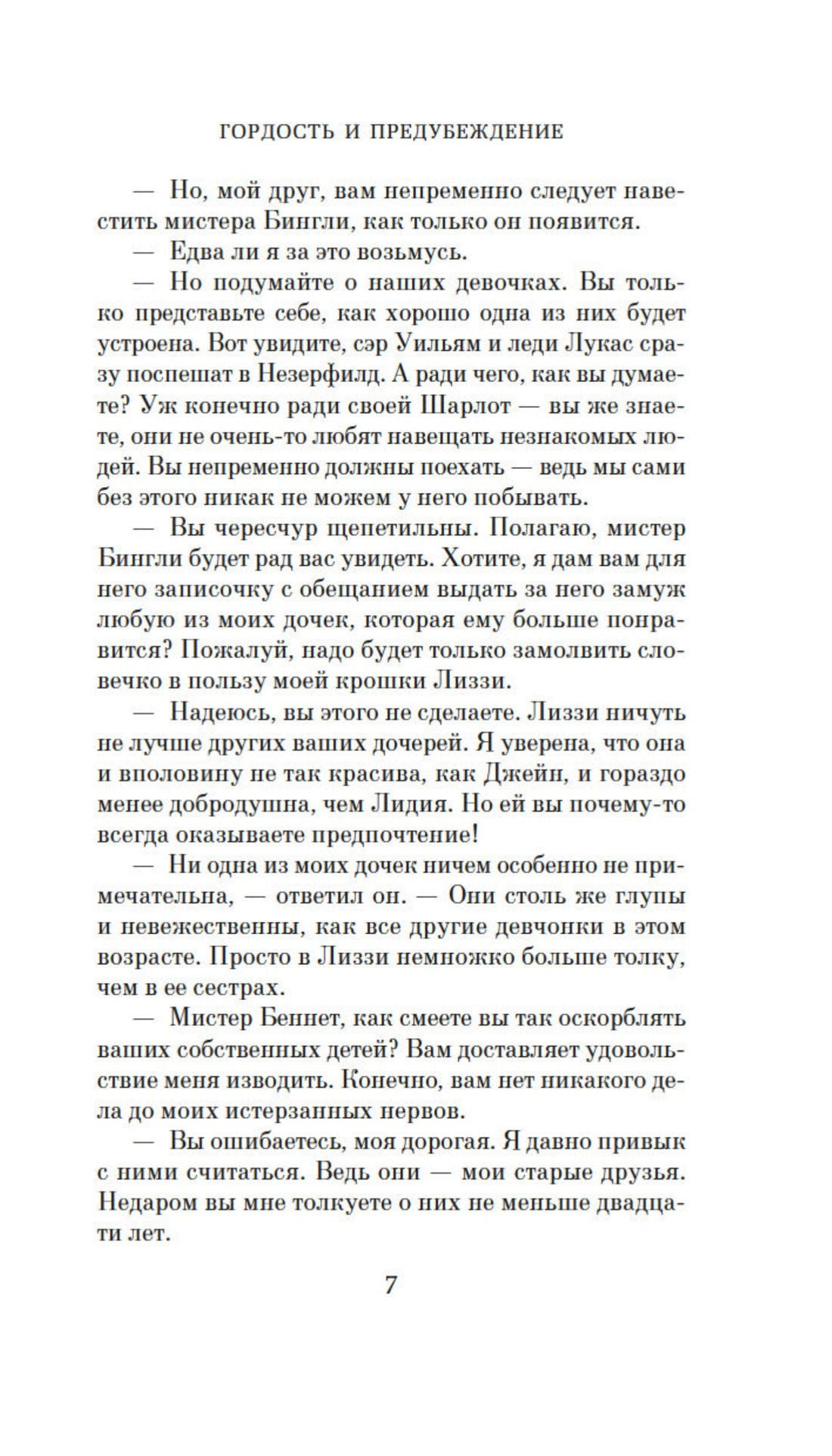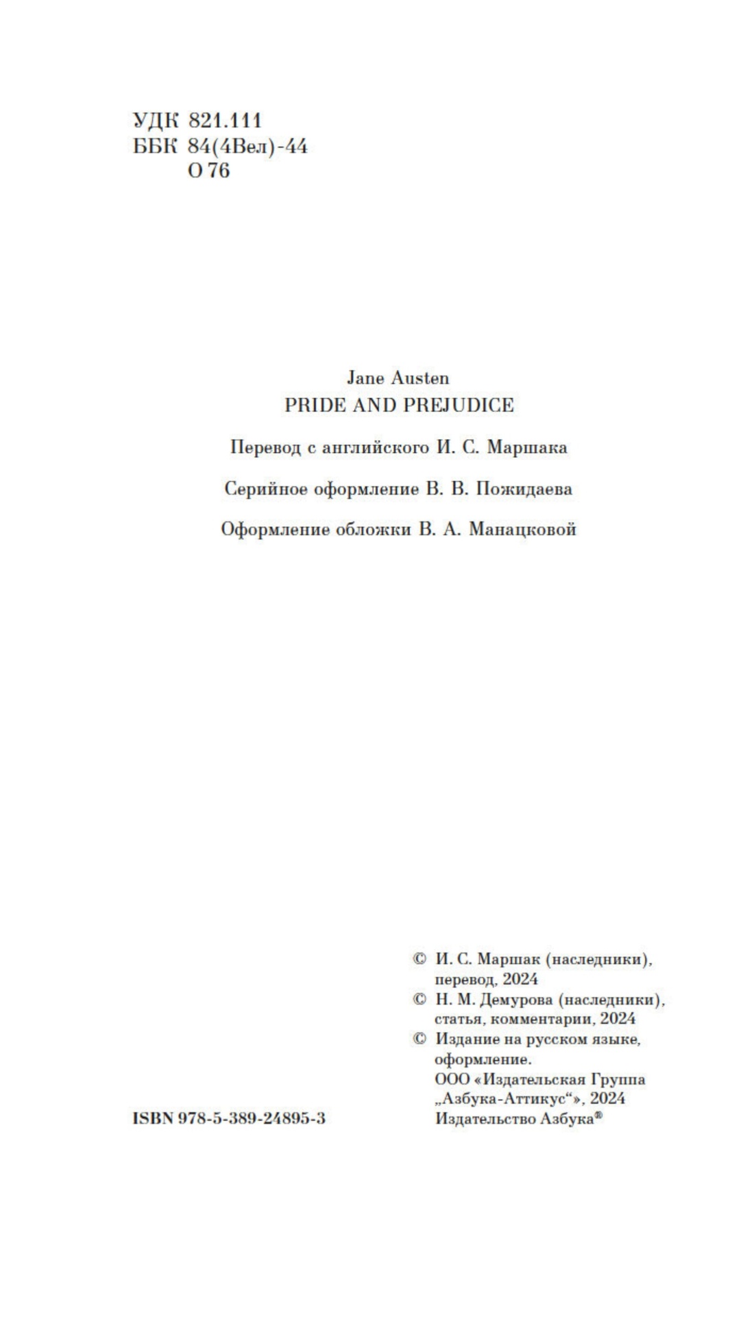 Книги знаменитой английской писательницы Джейн Остин уже давно снискали славу и читательскую любовь во всем мире. Обыденная жизнь обычных людей, подробности провинциального быта — вот сфера ее писательских интересов. Однако острый ум, искрометный юмор и тонкая всепроникающая ирония придают произведениям Остин изящество и глубину. Над романом «Гордость и предубеждение» писательница начала работу в 21 год. Издатели отвергли рукопись, и она пролежала под спудом более пятнадцати лет. Лишь после успеха романа «Чувство и чувствительность» Джейн Остин смогла выпустить свое «любимое детище». Перед публикацией она подвергла его тщательной обработке и достигла необычайного сочетания веселости, непосредственности, зрелости мысли и мастерства. Не случайно именно роман «Гордость и предубеждение», до сих пор не утративший своего очарования и блеска, считается наиболее совершенным из всего, что написала Джейн Остин. Среди многочисленных экранизаций романа можно отметить замечательный сериал 1995 года, снятый режиссером Саймоном Лэнгтоном (главные роли исполнили Колин Фёрт и Дженнифер Эль). В настоящем издании текст романа публикуется в каноническом переводе Иммануэля Самойловича Маршака.